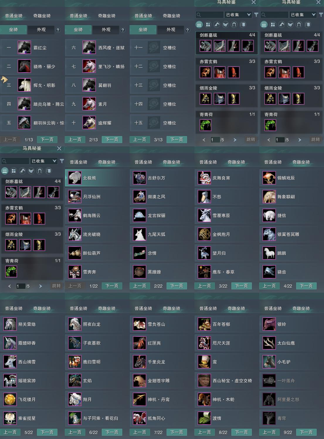 【坐骑】10个[踏炎腾云, 西风瘦逐狱, 翻羽抹云驹惊华, 里飞沙晴扬, 挥戈明影, 骁将骊少, 霸红尘]