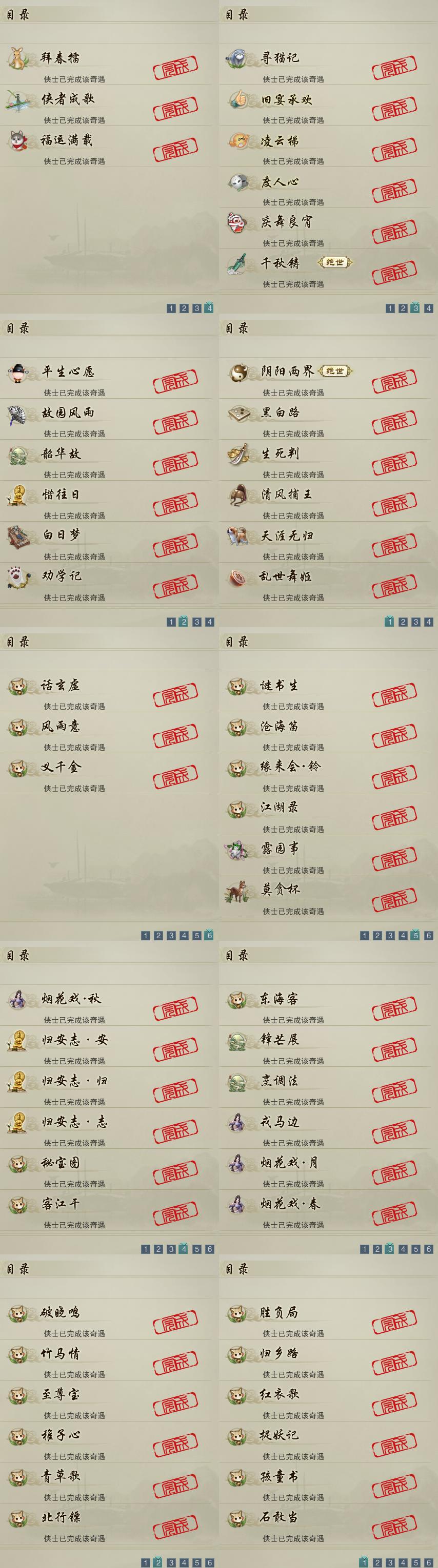 【奇遇】21个[白日梦, 天涯无归, 劝学记, 阴阳两界, 平生心愿, 黑白路, 惜往日, 乱世舞姬, 韶华故, 故园风雨, 清风捕王, 寻猫记, 庆舞良宵, 生死判, 凌云梯, 千秋铸, 度人心, 旧宴承欢, 侠者成歌, 拜春擂, 福运满载]