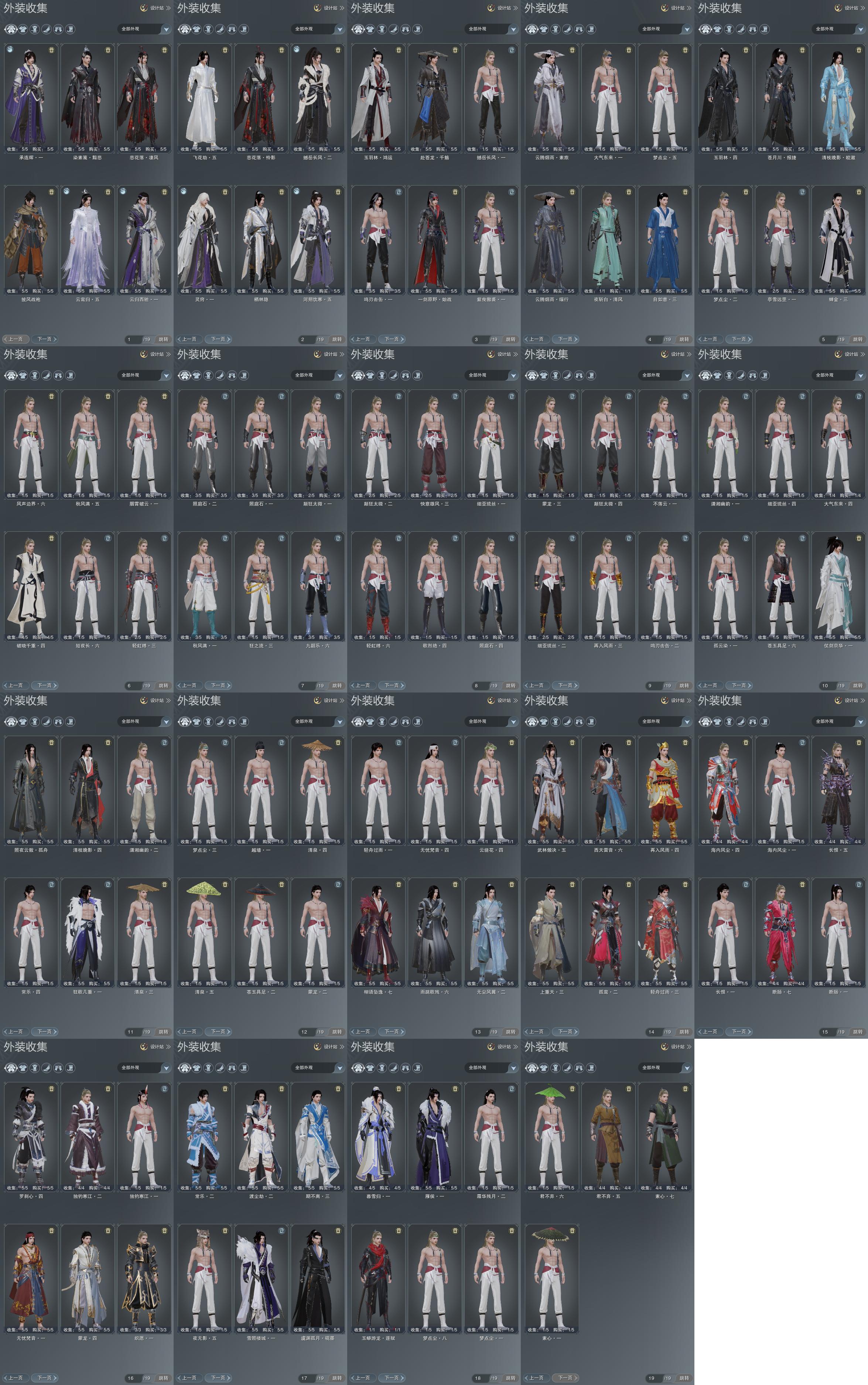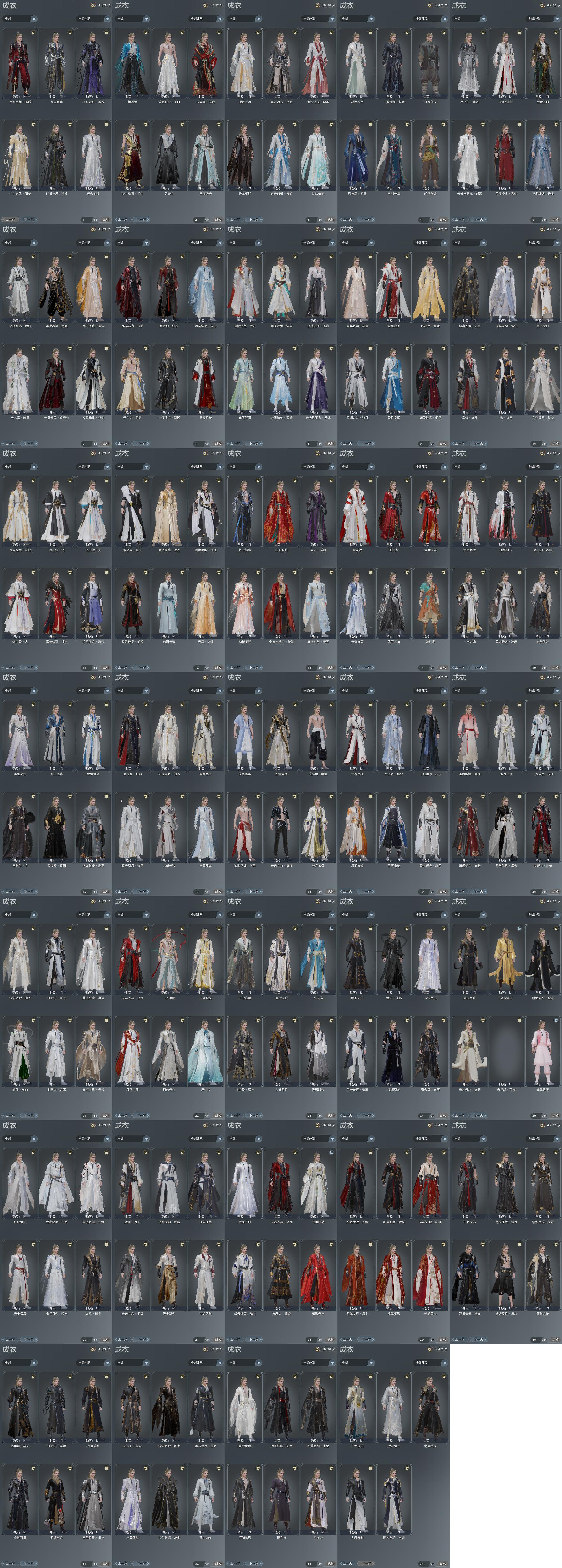 限时限量:[明镜高悬, 富婆套, 打歌服, 重华绯仪, 兰庭冷绣, 红玫瑰, 雪衣寒月, 望云绛霞, 紫舞步, 霆螭月华, 霆螭玄苍, 十三万资历衣, 十六万资历衣, 冷霜槛菊, 雾影霜奈, 兰若青溪, 烟花套, 黑枕戈, 镜湖云遥, 琴台顾金粟, 夜沉列星, 十二周年工作服, 客行逍遥夜影, 客行逍遥撷英, 客行逍遥天旷, 小红龙衣, 一期福袋成衣, 幽涧愀兮, 黑泳衣, 十三周年成衣, 天河对影云砂, 万川青绿黛瑾, 粉浪海, 十四周年工作服, 云闲归鹤, 浮光绡]