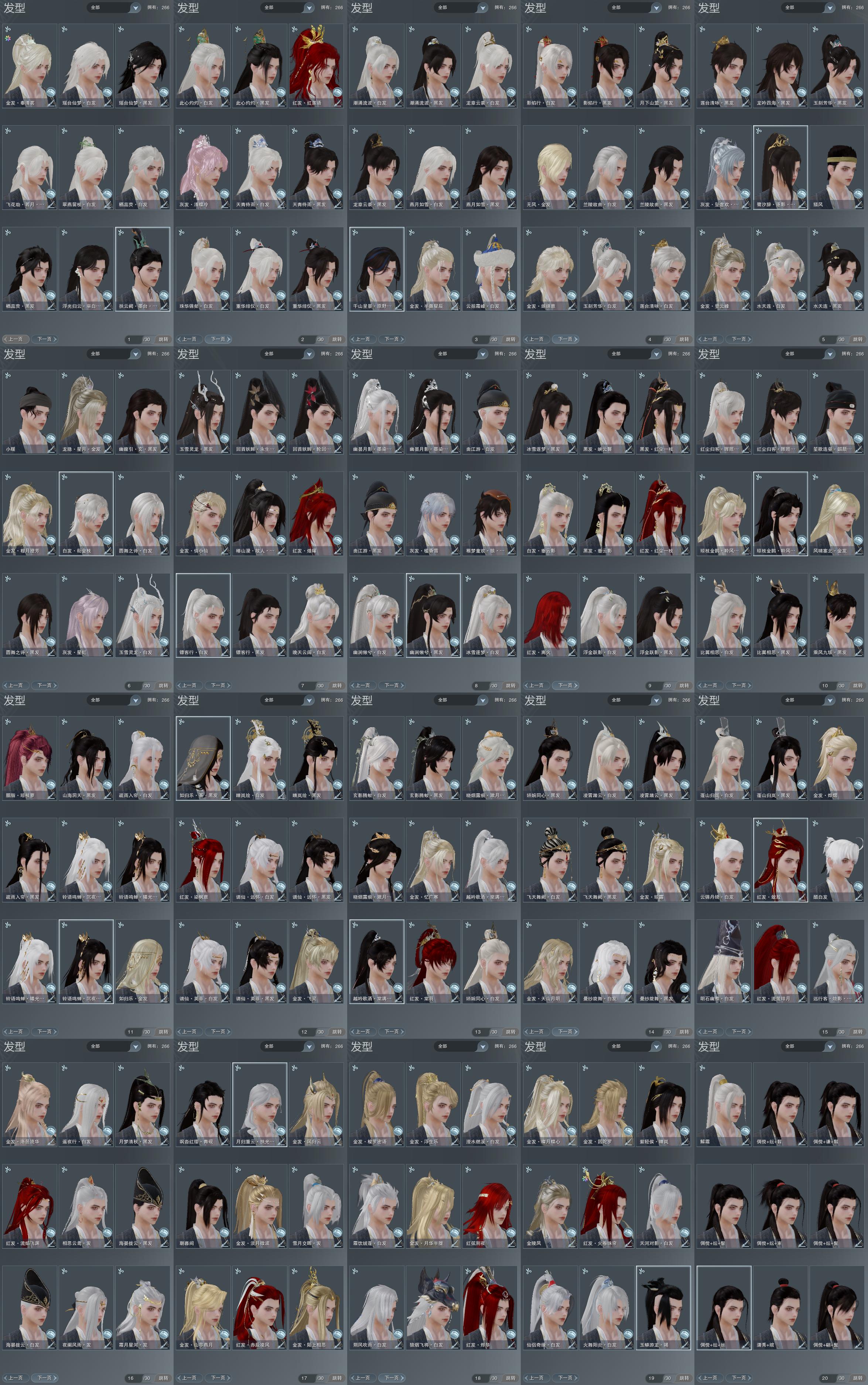 【发型】金发27个[一代金, 狐金, 猴金, 兔金, 资历金, 鸡金, 喵金, 考金, 国金, 倒闭金, 狗金, 玫瑰金, 猪金, 丝路金, 珊瑚金, 飒金, 如归金, 独孤九金, 刺金, 穆金, 三代金, 咩金, 无风金发, 精灵金, 金发奉清茗, 白琼枝金发, 紫龙隐金发], 红发18个[六红, 七红, 八红, 九红, 十红, 十二红, 紫发, 蝶粉, 鸡红, 猪红, 鼠红, 兔红, 小资历红, 大资历红, 十六红, 二代灰, 一代灰, 三代灰银], 黑发64个, 白发62个, 盒子发型[曲江游白发, 二代花朝黑, 丝路黑, 狄仁杰黑, 踏云黑发, 飞天黑发, 四代七夕黑发, 四代中秋粉黑发, 狗白, 绿盒黑发, 白端午白发, 小白龙黑发, 黑端午白发, 黑谪仙黑发, 狄仁杰白, 绿谪仙黑发, 二代元宵白, 三代七夕白, 晴岚绘黑发, 雪月白发, 白楼兰黑发, 黑楼兰黑发, 二代花朝白, 丝路白, 踏云白发, 飞天白发, 澡盒黑发, 四代七夕白发, 四代中秋粉白发, 绿盒白发, 二代乘风黑发, 五代七夕黑发, 小白龙白发, 黑谪仙白发, 绿谪仙白发, 晴岚绘白发, 白楼兰白发, 黑楼兰白发, 澡盒白发, 五代七夕白发, 白琼枝黑发, 唐风韶颜黑发, 黑红尘黑发, 小金龙黑发, 黑红尘白发, 小金龙白发, 十二黑, 花滑黑发, 花滑白发, 狼盒黑发, 曲江游黑发, 黑幽昙黑发, 幽涧愀兮白发, 镖盒黑发, 黑幽昙白发, 镖盒白发, 黑椿山黑发, 红黑妖眸盒黑发, 棕黑妖眸盒黑发, 灵龙盒黑发, 圆舞盒黑发, 灵龙白发, 圆舞盒白发, 黑幽馥黑发, 黑鹭黑发, 龙吟盒黑发, 莲台盒黑发, 兰陵盒黑发, 九七黑发, 镰刀黑发, 莲台盒白发, 兰陵盒白发, 蓝千山黑发, 镰刀白发, 燕月盒黑发, 墨龙盒黑发, 云掠霜峰白发, 燕月盒白发, 墨龙盒白发, 潮涌盒黑发, 瓷盒黑发, 潮涌盒白发, 瓷盒白发, 十七黑发, 黑战国黑发, 白浮光黑发, 十七白发, 瑶台仙梦黑发, 瑶台仙梦白发], 总页数20