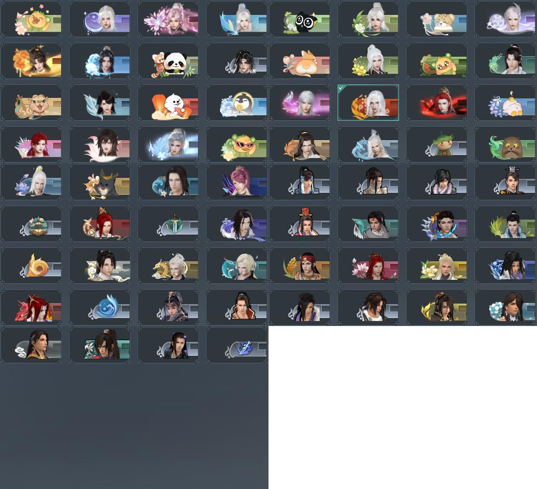 盒子:[黑盒, 丝路盒, 白端午盒(缺腰挂), 雪月盒, 踏云盒, 黑端午盒, 秃盒, 狄盒, 二代花朝盒, 红盒, 狗盒, 喵盒, 小白龙盒, 猪盒, 三七盒, 四代七夕盒, 五七盒, 二代乘风盒(缺白发), 貂盒, 红腿盒(缺白发), 毒盒, 蓬莱盒, 四中粉盒(缺背挂), 灯盒, 飞天盒, 青盒, 黑谪仙, 三代绿重阳盒, 绿谪仙, 白盒, 苍盒, 二代元宵盒, 澡盒, 刀宗盒, 白琼枝盒(豪), 三代元宵盒, 白楼兰盒, 黑楼兰盒, 黑四元盒, 小金龙盒, 莲台盒, 十七盒, 花滑盒, 曲江盒, 镖盒, 兔盒, 扇盒, 苍二盒, 唐二盒, 红黑妖龙盒(标), 棕黑妖龙盒(标), 莲华盒, 灵龙盒, 圆舞盒, 黑幽昙(标), 策二盒, 黑椿山盒(标), 黑幽馥(标), 九七盒(缺白发), 兰陵盒, 镰刀盒, 燕月盒, 墨龙盒, 黑鹭盒(标), 潮涌盒, 瓷盒, 瑶台仙梦礼盒, 蓝千山(标), 黑战国(标), 白浮光(标)]