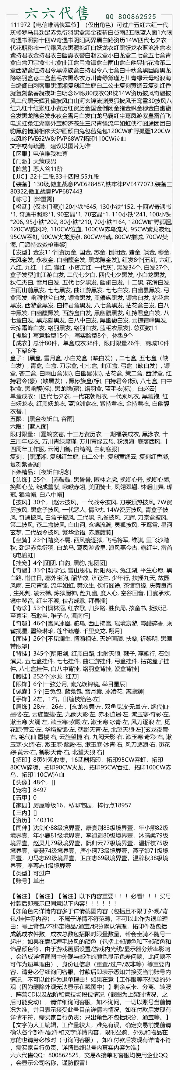 【如角色内详情内容多于详情截图内容(包括且不限于外观/背包/挂件等内容),不属于详情不符范畴,不可以此作为退单理由;号上背包/不绑定物品/通宝/积分默认清理,拓印件数包括成就成衣件数,成衣总数包括限时限量数量,帮会坐骑不随号一起出;如果在意狐狸毛披风的颜色(包括上部颜色和下部颜色和饰品颜色等,由于游戏画质设置/游戏内光线/显示器分辨率影响,会造成详情截图中外观与部件的颜色显示色差问题,此问题不可作为退单理由)、身份证信息(重置/过户/双非等)等重要内容,请务必仔细询问客服,付款后即表示悉知并接受当前账号内情况,不可以此作为退单理由!如果在意【工作服等不想要的外观(因为删除外观无法显示在截图中)】剩余点卡、分离、转服、阵营CD以及战阶和竞技场段位情况(截图为上架时情况,之后可能变动),请详细询问客服,如不询问,一切以账号当前情况为准,并且表示接受此号目前详情内情况,如在付款后发现有详情不符,需买家自行负责;只出角色不包括积分、通宝等。】