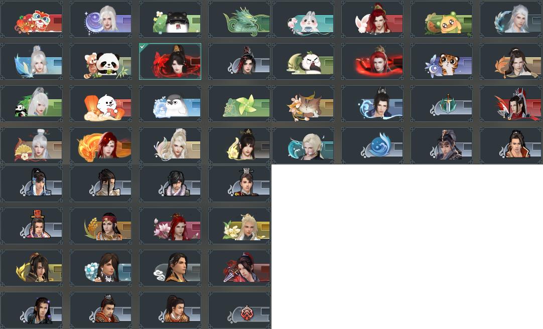 盒子:[黑盒, 雪月盒, 小白龙盒(缺白发), 二七盒, 五七盒(缺白发), 青盒, 白盒, 刀宗盒, 七七盒, 曲江盒, 弓盒(缺白发), 镖盒, 苍二盒, 白雨山盒(标), 白幽昙(标), 拈花盒, 策二盒, 西游盒, 红持君令(豪)(缺黑发), 黑傣族盒(标), 白持君令(标), 八七盒, 白中秋盒, 黑幽馥(标), 黑龙隐(豪), 络羽盒, 蓝毛衣(标),白赵云]