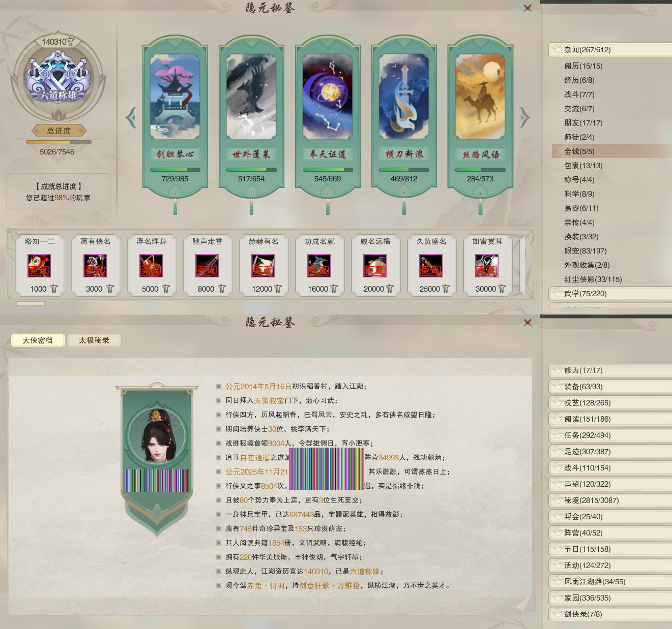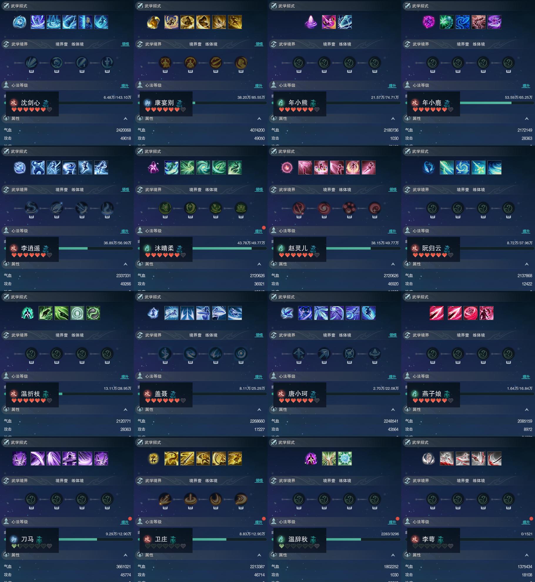【同伴】沈剑心88级境界壹,康宴别83级境界壹,年小熊82级境界壹,年小鹿81级境界壹,李逍遥80级境界壹,沐晴柔79级境界壹,赵灵儿79级境界壹,阮归云77级境界壹,温折枝75级境界壹,盖聂74级境界壹,唐小珂73级境界壹,燕子娘71级境界壹,刀马志69级境界壹,卫庄志69级境界壹,温辞秋38级境界壹,李萼志1级境界壹