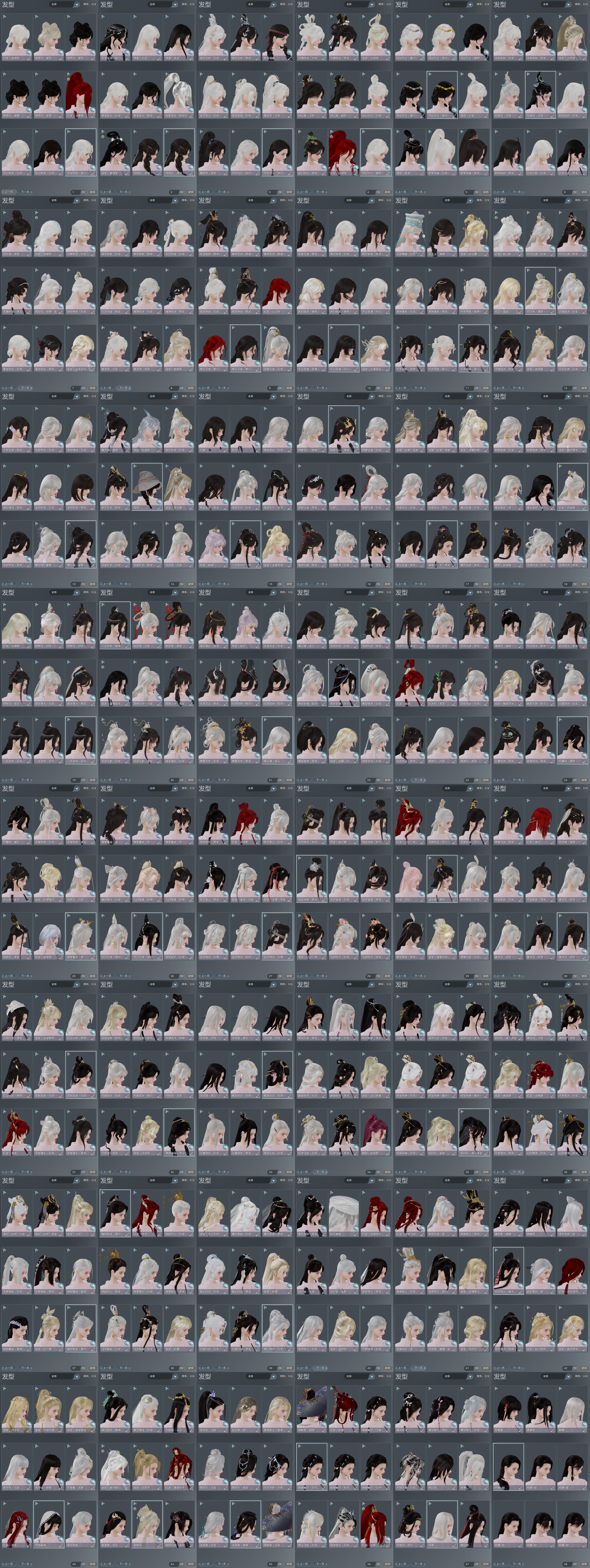 【发型】金发46个[一代金, 狐金, 猴金, 兔金, 资历金, 鼠金, 中秋金, 鸡金, 蝶金, 喵金, 考金, 苏金, 狗金, 龙女金, 猪金, 丝路金, 珊瑚金, 飒金, 苍金, 如归金, 凤金, 牛金, 云金, 女仆金, 雪金, 海金, 蔷薇金, 穆金, 水母金, 龙金, 三代金, 咩金, 铃金, 玄江金发, 精灵金, 蛇金, 永夜金, 翎金, 七中金发, 金发奉清茗, 白琼枝金发, 紫人间金发, 白龙隐金发, 紫月下金发, 白陇西金发, 绿毛衣金发], 红发27个[五红, 十八万灰, 七红, 八红, 九红, 十红, 十二红, 十四红, 紫发, 凤仙粉, 蝶粉, 羊红, 猴红, 鼠红, 牛红, 虎红, 兔红, 小资历红, 大资历红, 十五红, 蛇红, 紫寻香红发, 十六红, 马红, 二代灰, 一代灰, 三代灰金], 黑发202个, 白发148个, 盒子发型[二代花朝黑, 一代粉中秋白, 丝路黑, 一代七夕白, 狄仁杰黑, 二代七夕白, 一代花朝白白, 飞天黑发, 四代七夕黑发, 四代中秋蓝黑发, 紫盒黑发, 小白龙黑发, 黑端午白发, 黑谪仙黑发, 狄仁杰白, 二代元宵白, 二代重阳白, 三代中秋白, 乘风黑发, 三代七夕白, 晴岚绘黑发, 雪月白发, 山吹樱雪黑发, 棉袄白, 白楼兰黑发, 黑楼兰黑发, 二代花朝白, 丝路白, 蓝如归黑发, 踏云白发, 飞天白发, 澡盒黑发, 四代七夕白发, 飞皇黑发, 幽阑黑发, 四代中秋蓝白发, 同人黑发, 二代乘风黑发, 紫盒白发, 五代七夕黑发, 小白龙白发, 黑谪仙白发, 紫重阳黑发, 乘风白发, 晴岚绘白发, 山吹樱雪白发, 白楼兰白发, 墨心黑发, 黑楼兰白发, 浮岚黑发, 净尘黑发, 澡盒白发, 飞皇白发, 幽阑白发, 同人白发, 月轻语黑发, 二代乘风白发, 五代七夕白发, 晚日黑发, 紫重阳白发, 蓝曲塘黑, 白琼枝黑发, 墨心白发, 浮岚白发, 沧海黑发, 唐风玉壶黑发, 黑红尘黑发, 月轻语白发, 黑狮黑发, 白狮黑发, 流萤白发, 沧海白发, 小金龙黑发, 唐风玉壶白发, 黑红尘白发, 黑狮白发, 白狮白发, 白明光黑发, 小熊黑发, 孔雀黑发, 鉴松影隅中黑发, 小金龙白发, 红六七黑发, 十二黑, 芙蓉黑发, 六代中秋黑发, 白海岛黑发, 小熊白发, 黑海岛黑发, 孔雀白发, 红六七白发, 芙蓉白发, 六代中秋白发, 原色异域黑发, 蓝异域黑发, 红懒猪黑发, 蝴蝶黑发, 原色异域白发, 蓝异域白发, 星源黑发, 白懒猪白发, 白忘川黑发, 蝴蝶白发, 紫人间黑发, 星源白发, 羊盒黑发, 白忘川白发, 狼盒黑发, 箜篌黑发, 紫雨山前黑发, 七七黑发, 羊盒白发, 竹露响暮云黑发, 狼盒白发, 竹露响霜色黑发, 箜篌白发, 七七白发, 白幽昙黑发, 雏菊黑发, 幽涧愀兮白发, 白玄玉黑发, 镖盒黑发, 黑傣族黑发, 雏菊白发, 金鳞盒黑发, 除夕盒黑发, NPC黑发, 卿酒盒黑发, 蓝钻石盒黑发, 白雪人白发, 镖盒白发, 不良人盒黑发, 黑椿山黑发, 踏青黑发, 金鳞盒白发, 青霄盒黑发, 除夕盒白发, 红白妖眸盒黑发, 红黑妖眸盒黑发, 卿酒盒白发, 蓝钻石盒白发, 灵龙盒黑发, 虹猫盒黑发, 不良人盒白发, 蓝兔盒黑发, 圆舞盒黑发, 黑椿山白发, 拈花盒黑发, 蓝沧洲盒黑发, 粉沧洲盒黑发, 踏青白发, 紫沧洲盒黑发, 青霄盒白发, 黑沧洲盒黑发, 西游盒黑发, 白持君盒黑发, 灵龙白发, 红持君盒黑发, 虹兔盒白发, 蓝兔盒白发, 八七盒黑发, 圆舞盒白发, 拈花盒白发, 白八中黑发, 六代重阳黑发, 西游盒白发, 黑幽馥黑发, 青山盒黑发, 红持君盒白发, 天星盒黑发, 白龙隐黑发, 八七盒白发, 白八中白发, 六代重阳白发, 红香盒黑发, 游龙盒黑发, 青山盒白发, 婚纱盒黑发, 天星盒白发, 粉鹿黑发, 白观灯盒黑发, 红香盒白发, 海阔盒黑发, 游龙盒白发, 熊猫黑发, 茄盒黑发, 妙乐盒黑发, 白鹭黑发, 婚纱盒白发, 粉鹿白发, 黑鹭黑发, 龙吟盒黑发, 莲台盒黑发, 梦盒黑发, 兰陵盒黑发, 海阔盒白发, 熊猫白发, 茄盒白发, 妙乐盒白发, 九七黑发, 白鹭白发, 青蛇盒黑发, 白蛇盒黑发, 柿盒黑发, 龙吟盒白发, 红上火黑发, 莲台盒白发, 梦盒白发, 兰陵盒白发, 白千山黑发, 黄千山黑发, 九七白发, 青蛇盒白发, 柿盒白发, 白蛇盒白发, 白陇西黑发, 燕月盒黑发, 墨龙盒黑发, 白千山白发, 紫寻香黑发, 云掠霜峰白发, 瑶华盒黑发, 蓝蝴蝶黑发, 红故梦黑发, 燕月盒白发, 墨龙盒白发, 重花游黑发, 瑶华盒白发, 仙剑黑发, 潮涌盒黑发, 蓝蝴蝶白发, 络羽黑发, 瓷盒黑发, 云间盒黑发, 发财黑发, 蓝洛神黑发, 傀儡黑发, 仙剑白发, 重花游白发, 潮涌盒白发, 络羽白发, 瓷盒白发, 渡我黑发, 云间盒白发, 红沙丘黑发, 发财白发, 蓝沙丘黑发, 蓝洛神白发, 紫沙丘黑发, 傀儡白发, 十七黑发, 红战国黑发, 白战国黑发, 渡我白发, 玉璃盒黑发, 红沙丘白发, 蓝沙丘白发, 紫沙丘白发, 白浮光黑发, 十七白发, 瑶台仙梦黑发, 玉璃盒白发, 涉烟尘流徵黑发, 白浮光白发, 涉烟尘清商黑发, 魔镜黑发, 白波斯黑发, 紫天山黑发, 瑶台仙梦白发, 魔镜盒白发, 红毛衣黑发, 白波期白发, 粉毛衣黑发, 紫天山白发, 绿毛衣黑发], 总页数48
