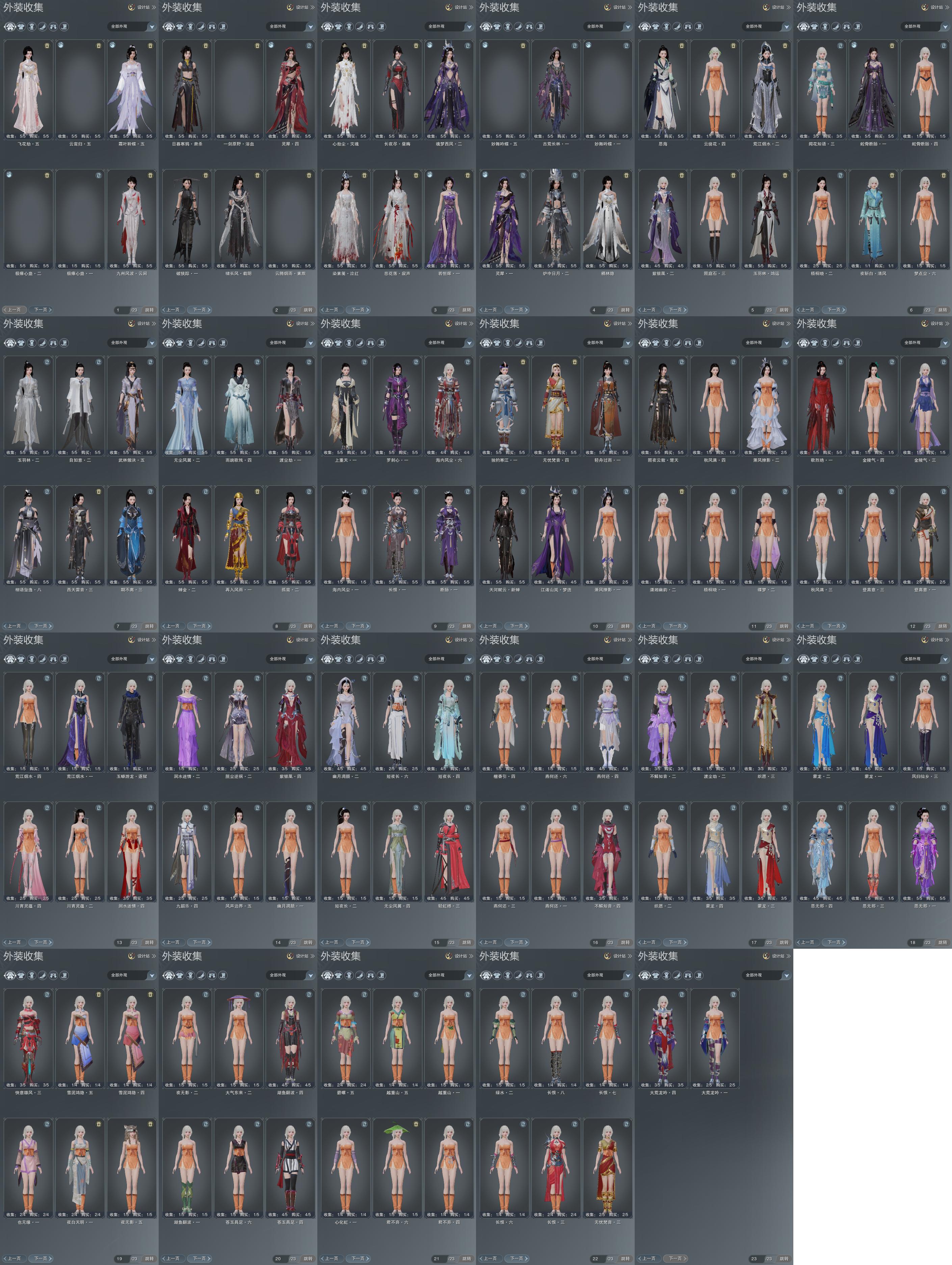 限时限量:[明镜高悬, 打歌服, 粉九壤, 水云寒雪涛, 点春晴, 重华绯仪, 海韵小调, 兰庭金烬, 月寒凌苍, 红玫瑰, 红九天, 雪衣寒川, 雪衣寒江, 绿长天, 雪衣寒月, 白长天, 绿封川, 黑天涯, 望云绛霞, 紫舞步, 霆螭煌天, 十三万资历衣, 十六万资历衣, 侠影空山, 冷霜芳萼, 金浮琅玉, 牧原胡装, 雾影孤鸿, 寒梅日暮, 寒梅晚萼, 容与自适, 黄长安, 绿长安, 紫长安, 烟花套, 黑枕戈, 琴台顾鸣筝, 琴台顾素手, 楚山流光, 楚山破晓, 楚山余晖, 点寒星映涟, 点寒星沉玉, 夜沉列星, 十二周年工作服, 玉悬窗棠语, 客行逍遥夜影, 客行逍遥撷英, 客行逍遥天旷, 一期福袋成衣, 新锦绣明辉, 白泳衣, 黑泳衣, 黄泳衣, 蓝泳衣, 十三周年成衣, 梦生秋淡云, 梦生秋月影, 蓝水母, 粉水母, 天河对影云砂, 万川青绿黛瑾, 万川青绿石琅, 万川青绿云母, 万川青绿辰砂, 蓝浪海, 庭落西风, 十四周年工作服, 云闲归鹤, 紫清光, 蓝绮阁, 浮光绡, 蓝碧海, 黑碧海, 蓝游仙, 粉游仙, 绿游仙, 紫游仙, 白刺客服]