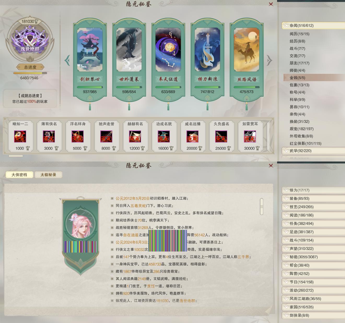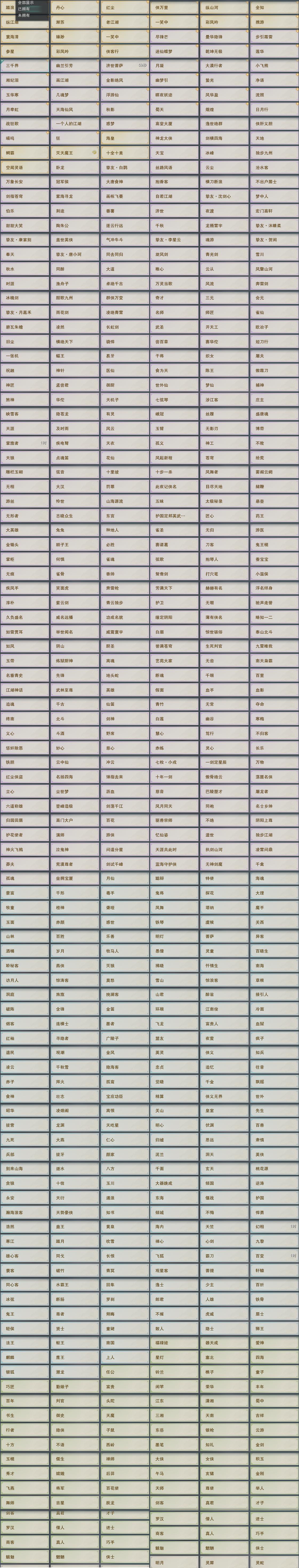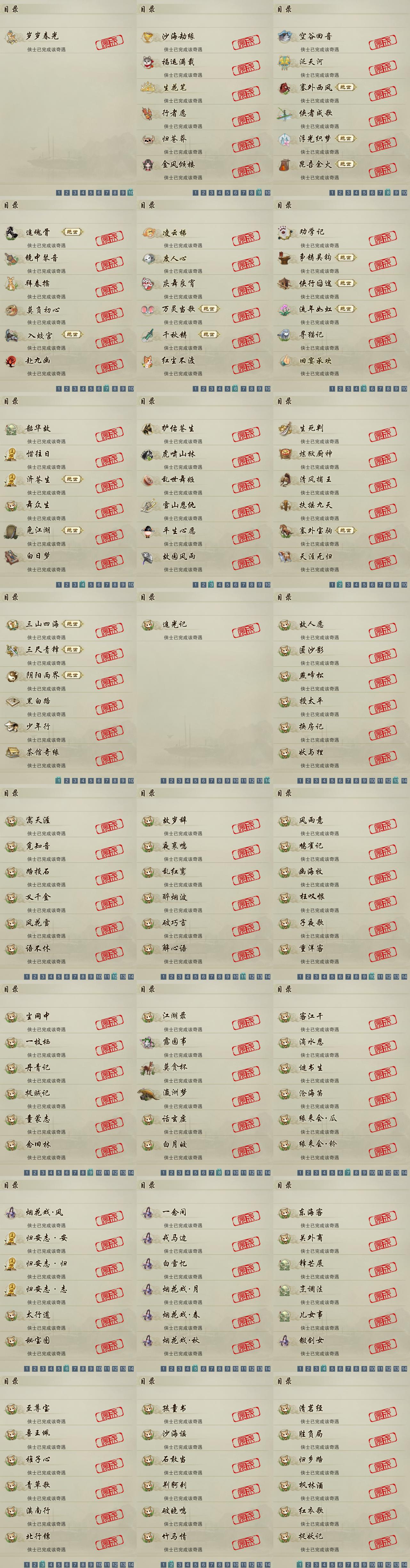 【奇遇】53个[白日梦, 天涯无归, 三山四海, 劝学记, 雪山恩仇, 阴阳两界, 莫负初心, 兔江湖, 平生心愿, 黑白路, 惜往日, 乱世舞姬, 塞外宝驹, 争铸吴钩, 韶华故, 虎啸山林, 济苍生, 护佑苍生, 少年行, 故园风雨, 扶摇九天, 三尺青锋, 流年如虹, 舞众生, 清风捕王, 侠行囧途, 寻猫记, 茶馆奇缘, 入蛟宫, 庆舞良宵]
