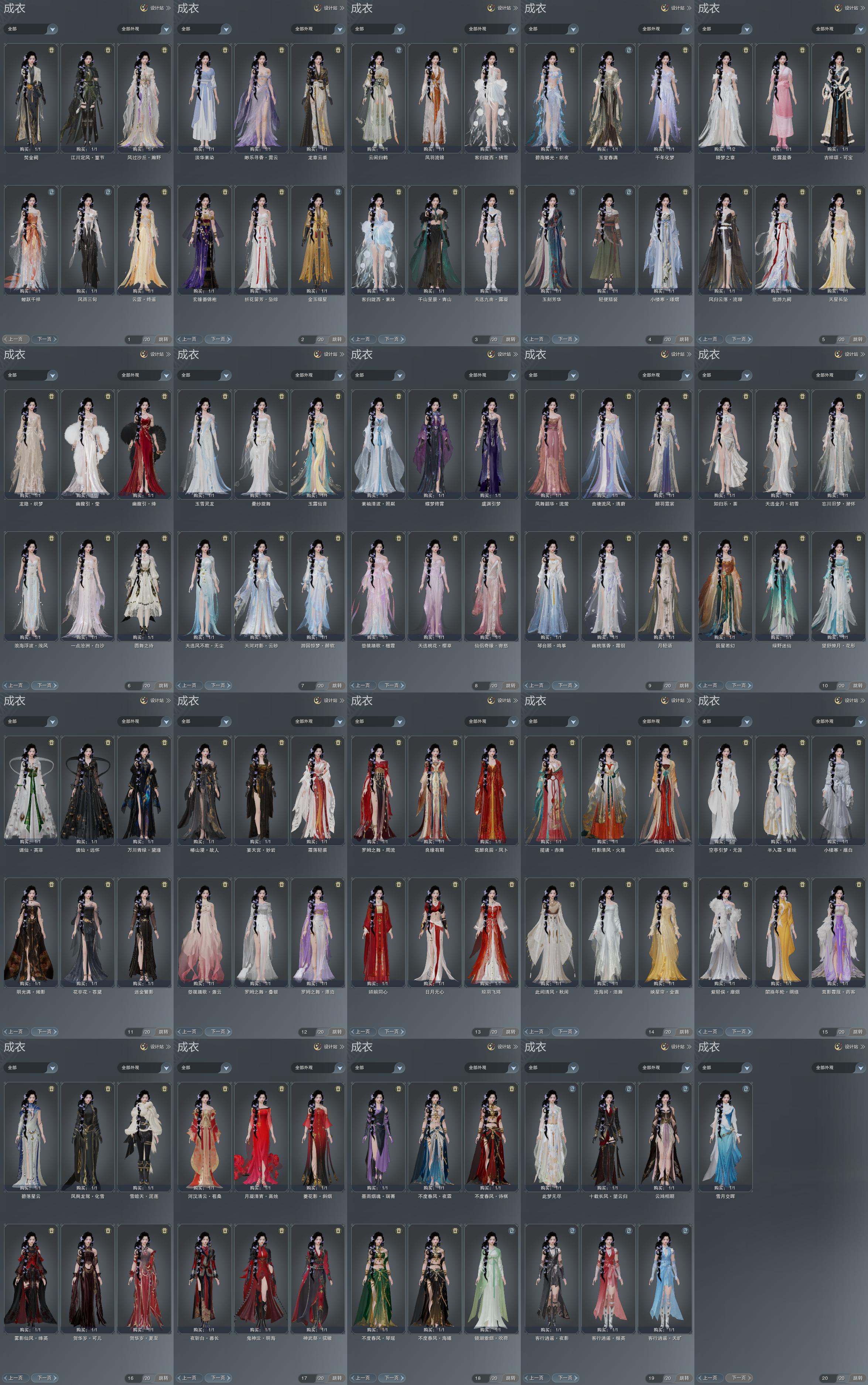 限时限量:[西津衣, 玄缘袍, 红玫瑰, 十三万资历衣, 十六万资历衣, 雾影绛英, 烟花套, 镜湖吹荷, 琴台顾鸣筝, 十二周年工作服, 客行逍遥夜影, 客行逍遥撷英, 客行逍遥天旷, 一期福袋成衣, 十三周年成衣, 粉水母, 天河对影云砂, 万川青绿黛瑾, 蓝浪海, 云闲归鹤, 蓝碧海]