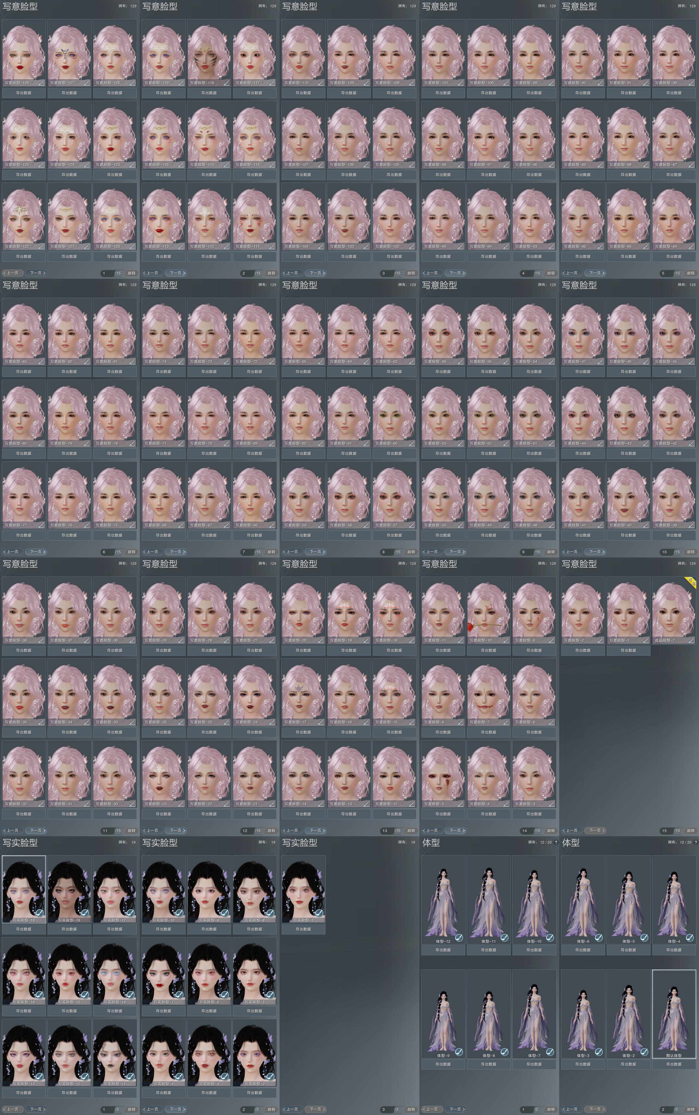 【捏脸】写意脸型129个,写实脸型19个,体型12个