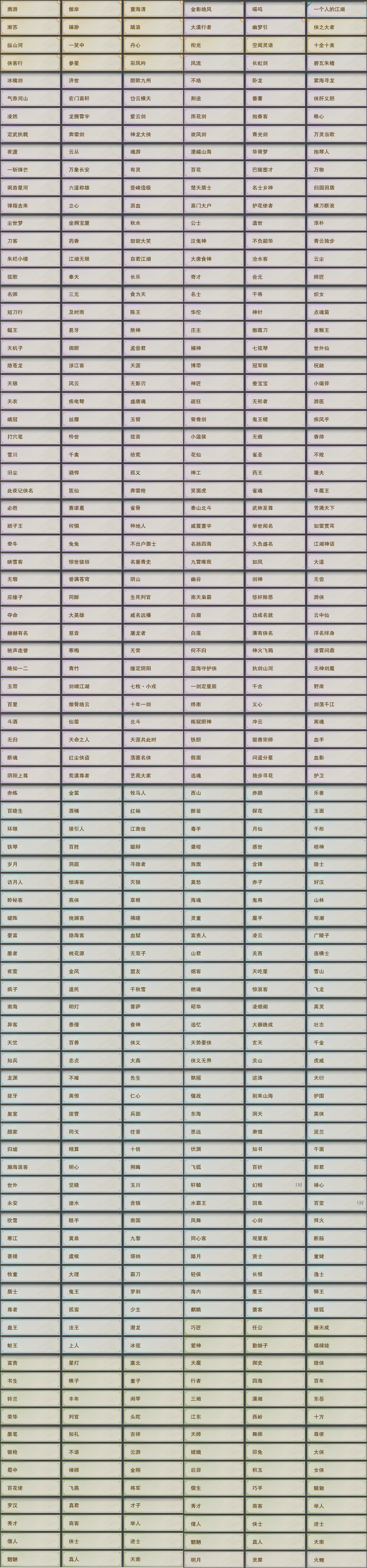 【奇遇】45个[白日梦, 天涯无归, 三山四海, 劝学记, 雪山恩仇, 阴阳两界, 莫负初心, 兔江湖, 平生心愿, 黑白路, 惜往日, 乱世舞姬, 塞外宝驹, 争铸吴钩, 韶华故, 虎啸山林, 济苍生, 护佑苍生, 少年行, 故园风雨, 扶摇九天, 三尺青锋, 流年如虹, 舞众生, 清风捕王, 侠行囧途, 寻猫记, 茶馆奇缘, 庆舞良宵, 万灵当歌]