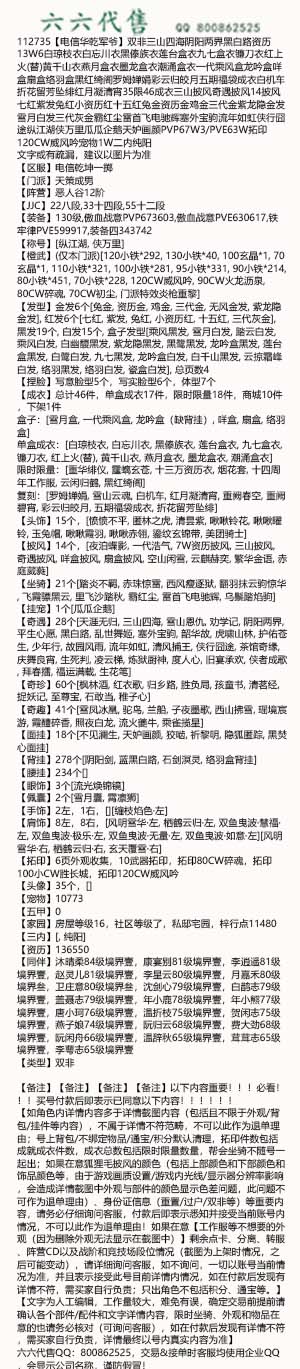 【如角色内详情内容多于详情截图内容(包括且不限于外观/背包/挂件等内容),不属于详情不符范畴,不可以此作为退单理由;号上背包/不绑定物品/通宝/积分默认清理,拓印件数包括成就成衣件数,成衣总数包括限时限量数量,帮会坐骑不随号一起出;如果在意狐狸毛披风的颜色(包括上部颜色和下部颜色和饰品颜色等,由于游戏画质设置/游戏内光线/显示器分辨率影响,会造成详情截图中外观与部件的颜色显示色差问题,此问题不可作为退单理由)、身份证信息(重置/过户/双非等)等重要内容,请务必仔细询问客服,付款后即表示悉知并接受当前账号内情况,不可以此作为退单理由!如果在意【工作服等不想要的外观(因为删除外观无法显示在截图中)】剩余点卡、分离、转服、阵营CD以及战阶和竞技场段位情况(截图为上架时情况,之后可能变动),请详细询问客服,如不询问,一切以账号当前情况为准,并且表示接受此号目前详情内情况,如在付款后发现有详情不符,需买家自行负责;只出角色不包括积分、通宝等。】