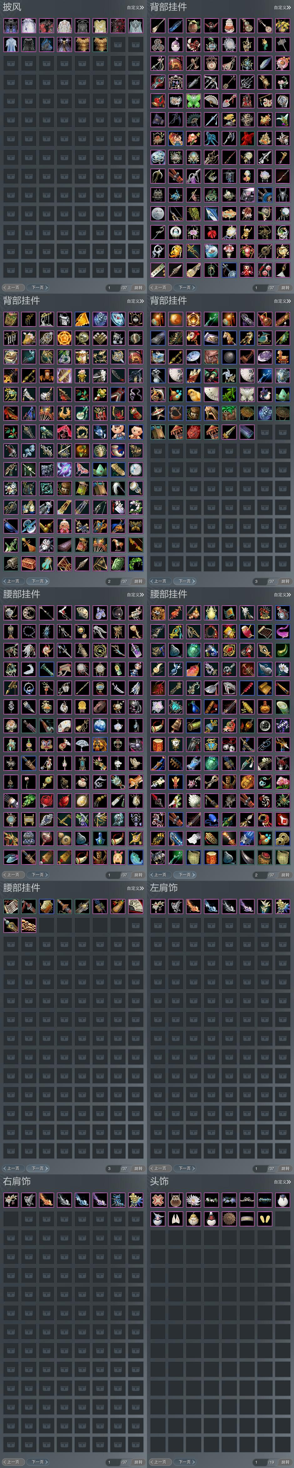 【披风】14个,[夜泊蝶影, 一代浩气, 7W资历披风, 三山披风, 奇遇披风, 咩盒披风, 扇盒披风, 空山闲雪, 云麒赫奕, 繁华金语, 赤庭葳蕤]