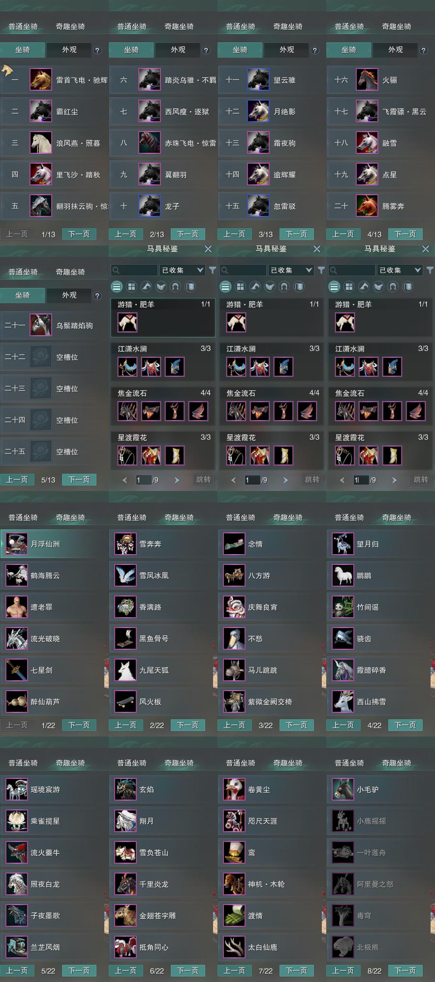 【坐骑】21个[踏炎不羁, 赤珠惊雷, 西风瘦逐狱, 翻羽抹云驹惊华, 飞霞骠黑云, 里飞沙踏秋, 霸红尘, 雷首飞电驰辉, 乌鬃踏焰驹]