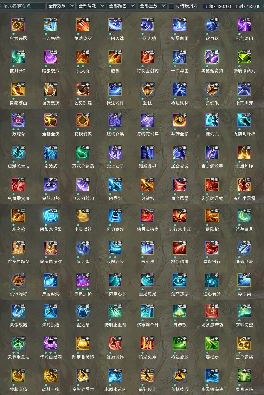 【橙武】(仅本门派)[120小铁*292, 130小铁*40, 100玄晶*1, 70玄晶*1, 110小铁*321, 100小铁*281, 95小铁*331, 90小铁*214, 80小铁*451, 70小铁*228, 120CW威风吟, 90CW火龙沥泉, 80CW碎魂, 70CW初尘, 门派特效炎枪重黎]