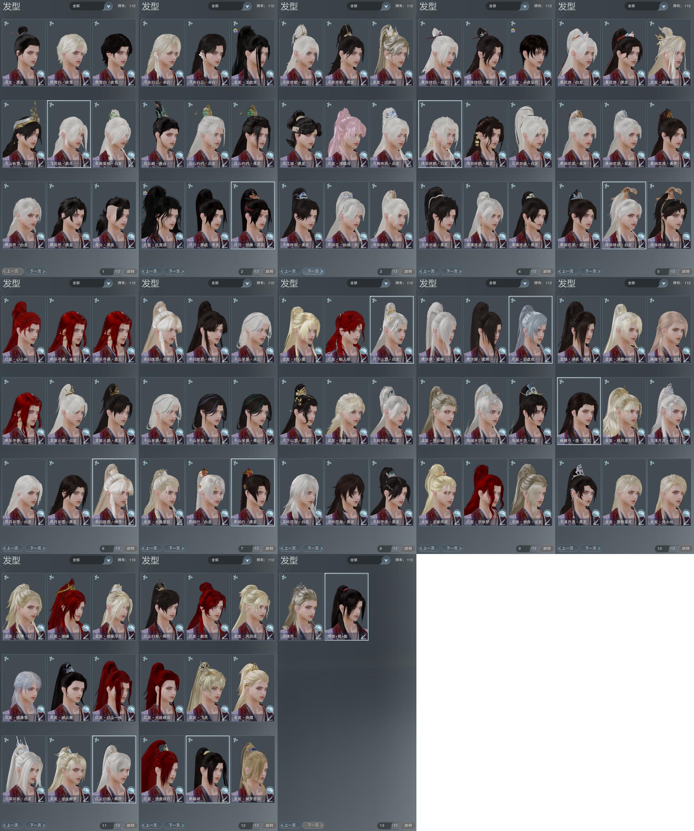 【发型】金发27个[一代金, 资历金, 猪金, 飒金, 凤金, 牛金, 雪金, 海金, 刺金, 蔷薇金, 穆金, 水母金, 龙金, 三代金, 咩金, 铃金, 精灵金, 蛇金, 永夜金, 翎金, 七中金发, 白幽馥金发, 黑龙隐金发, 彩陇西金发, 白陇西金发, 白浮光金发, 粉毛衣金发], 红发15个[十一红, 十二红, 蝶粉, 牛红, 兔红, 小资历红, 龙红, 十五红, 蛇红, 绿寻香红发, 紫寻香红发, 蓝寻香红发, 十六红, 一代灰, 三代灰金], 黑发38个, 白发29个, 盒子发型[黑红尘黑发, 黑红尘白发, 八七盒黑发, 白幽馥黑发, 八七盒白发, 黑龙隐黑发, 海阔盒黑发, 白鹭黑发, 龙吟盒黑发, 海阔盒白发, 九七黑发, 白鹭白发, 镰刀黑发, 龙吟盒白发, 绿千山黑发, 白千山黑发, 九七白发, 镰刀白发, 白陇西黑发, 燕月盒黑发, 绿千山白发, 墨龙盒黑发, 白千山白发, 瑶华盒黑发, 蓝蝴蝶黑发, 红蝴蝶黑发, 燕月盒白发, 墨龙盒白发, 重花游黑发, 瑶华盒白发, 仙剑黑发, 潮涌盒黑发, 蓝蝴蝶白发, 络羽黑发, 红蝴蝶白发, 瓷盒黑发, 傀儡黑发, 仙剑白发, 红问刀黑发, 重花游白发, 潮涌盒白发, 络羽白发, 黄问刀黑发, 瓷盒白发, 傀儡白发, 十七黑发, 黑战国黑发, 白浮光黑发, 十七白发, 紫天山黑发, 粉毛衣黑发], 总页数13