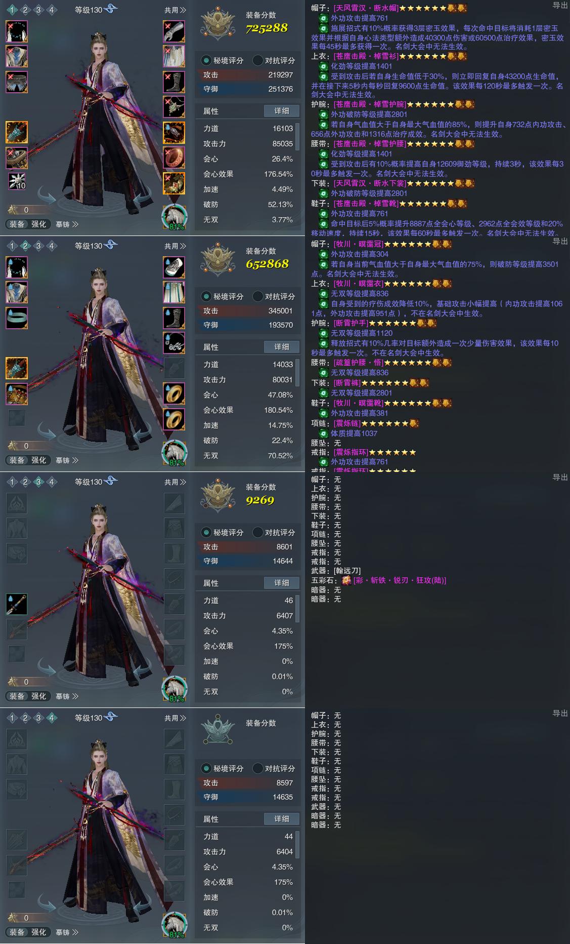 【装备】130级,孤锋诀PVP725288,孤锋诀PVE652868,装备三9269,装备四0