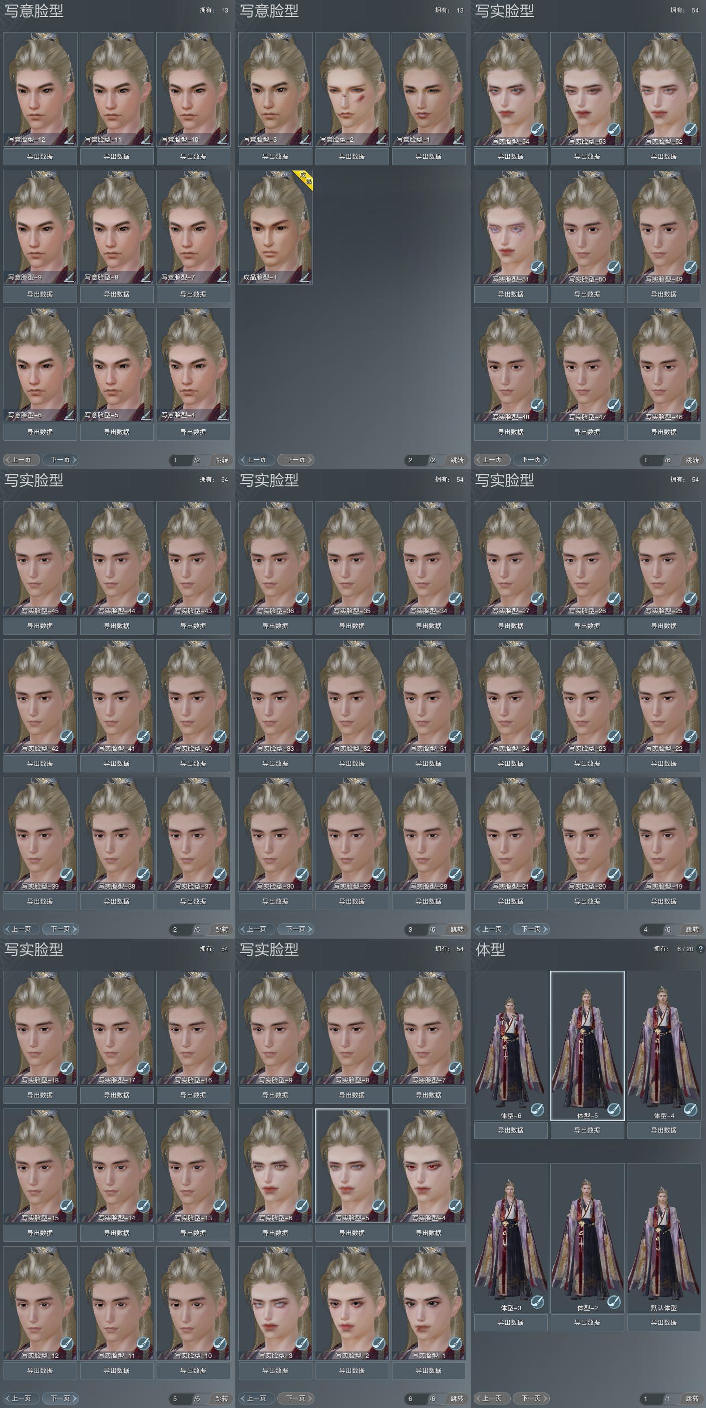 【捏脸】写意脸型13个,写实脸型54个,体型6个