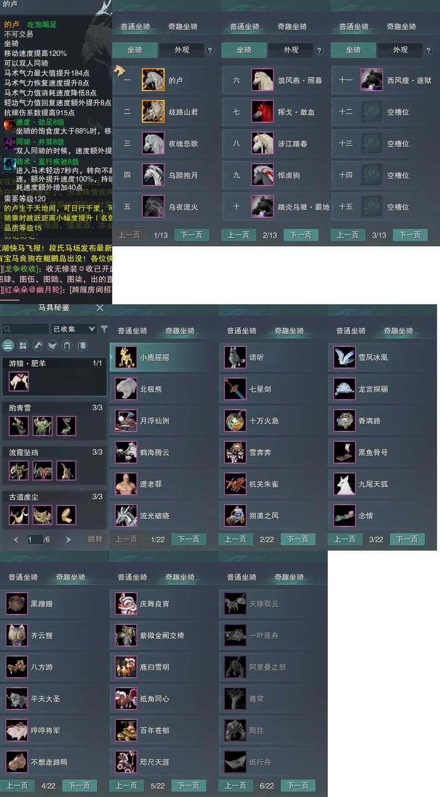 【坐骑】11个[的卢, 踏炎霸地, 西风瘦逐狱, 乌蹄抱月, 阵营白虎, 黑翅马, 挥戈歃血]