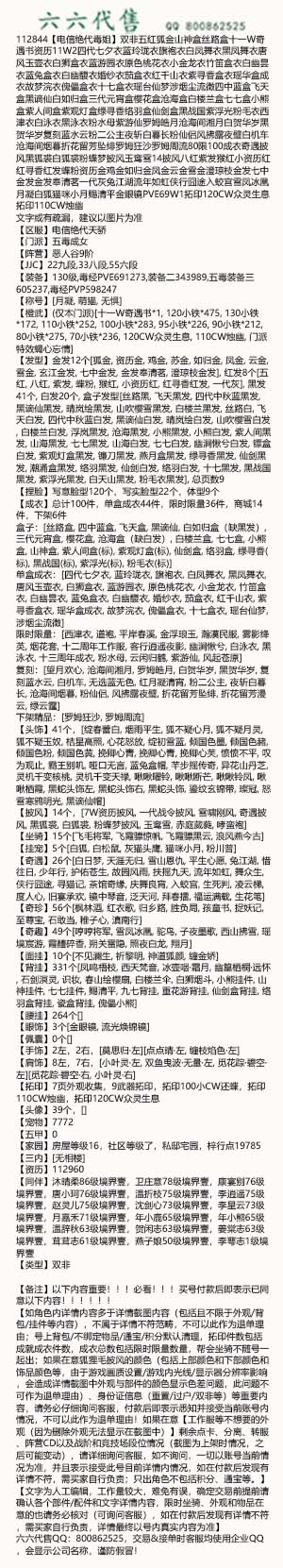 【如角色内详情内容多于详情截图内容(包括且不限于外观/背包/挂件等内容),不属于详情不符范畴,不可以此作为退单理由;号上背包/不绑定物品/通宝/积分默认清理,拓印件数包括成就成衣件数,成衣总数包括限时限量数量,帮会坐骑不随号一起出;如果在意狐狸毛披风的颜色(包括上部颜色和下部颜色和饰品颜色等,由于游戏画质设置/游戏内光线/显示器分辨率影响,会造成详情截图中外观与部件的颜色显示色差问题,此问题不可作为退单理由)、身份证信息(重置/过户/双非等)等重要内容,请务必仔细询问客服,付款后即表示悉知并接受当前账号内情况,不可以此作为退单理由!如果在意【工作服等不想要的外观(因为删除外观无法显示在截图中)】剩余点卡、分离、转服、阵营CD以及战阶和竞技场段位情况(截图为上架时情况,之后可能变动),请详细询问客服,如不询问,一切以账号当前情况为准,并且表示接受此号目前详情内情况,如在付款后发现有详情不符,需买家自行负责;只出角色不包括积分、通宝等。】