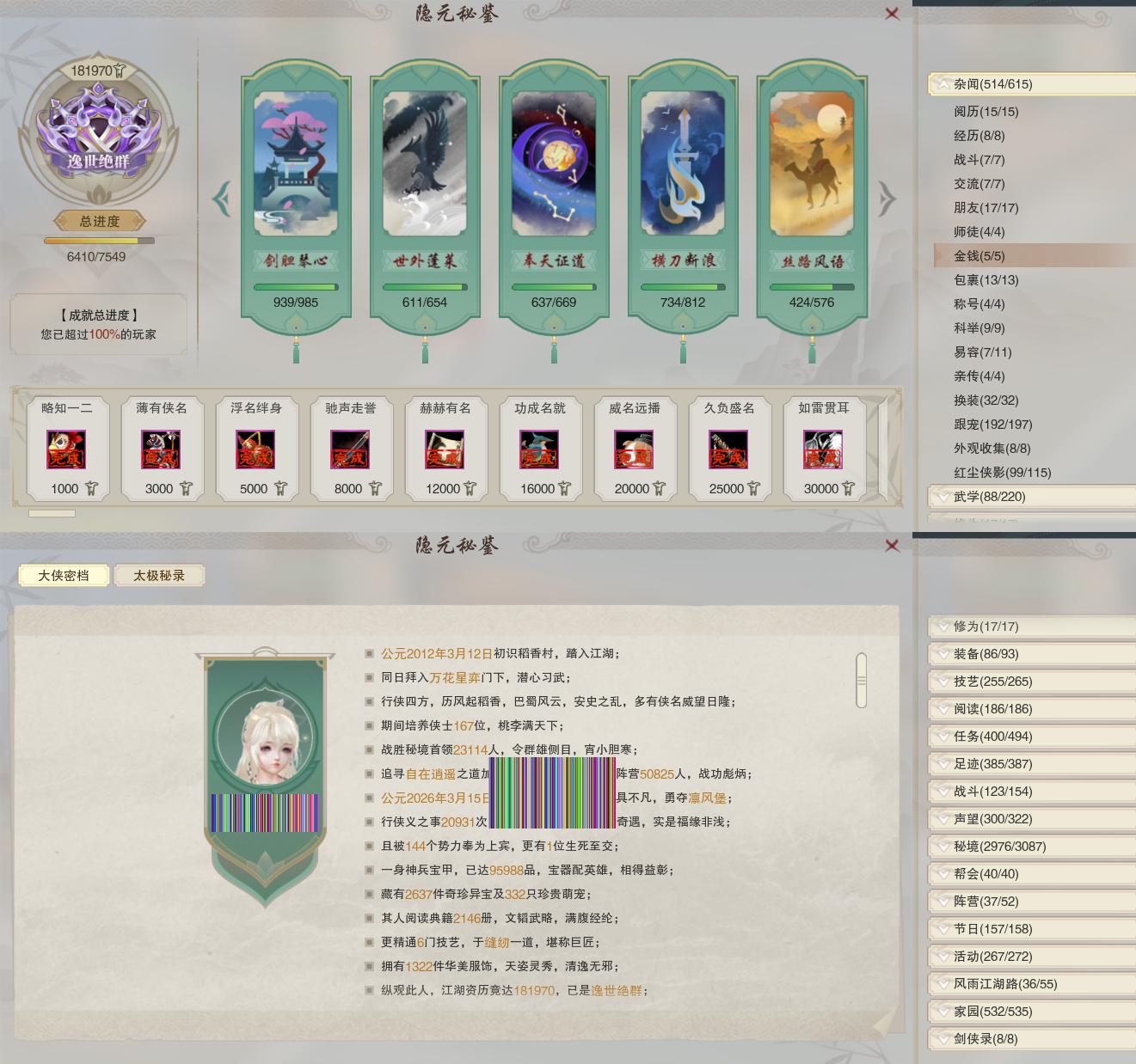 【奇遇】53个[白日梦, 天涯无归, 三山四海, 劝学记, 雪山恩仇, 阴阳两界, 莫负初心, 兔江湖, 平生心愿, 黑白路, 惜往日, 乱世舞姬, 塞外宝驹, 争铸吴钩, 韶华故, 虎啸山林, 济苍生, 护佑苍生, 少年行, 故园风雨, 扶摇九天, 三尺青锋, 流年如虹, 舞众生, 清风捕王, 侠行囧途, 寻猫记, 茶馆奇缘, 入蛟宫, 庆舞良宵]