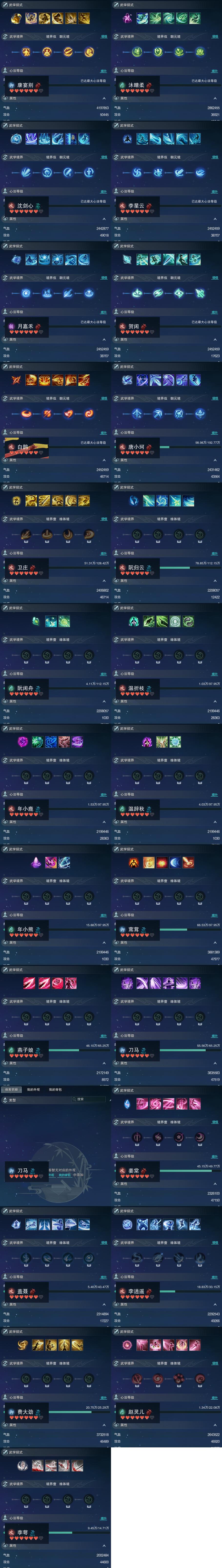 【同伴】康宴别90级境界伍,沐晴柔90级境界伍,沈剑心90级境界伍,李星云90级境界伍,月嘉禾90级境界伍,贺闲90级境界伍,白鹊香90级境界伍,唐小珂89级境界伍,卫庄86级境界壹,阮归云85级境界壹,阮闲舟85级境界壹,温折枝84级境界壹,年小鹿84级境界壹,温辞秋84级境界壹,年小熊84级境界壹,茸茸84级境界壹,燕子娘81级境界壹,刀马慈81级境界壹,刀马慈级,姜棠79级境界壹,盖聂78级境界壹,李逍遥76级境界壹,费大劲74级境界壹,赵灵儿73级境界壹,李萼意70级境界壹