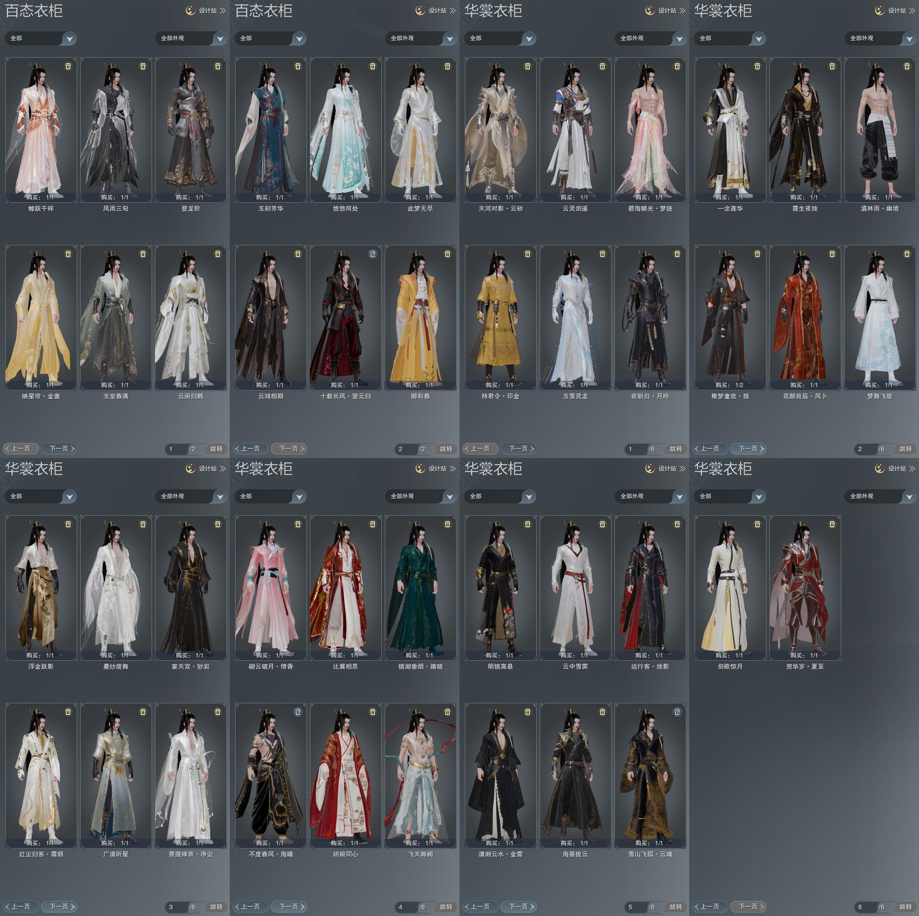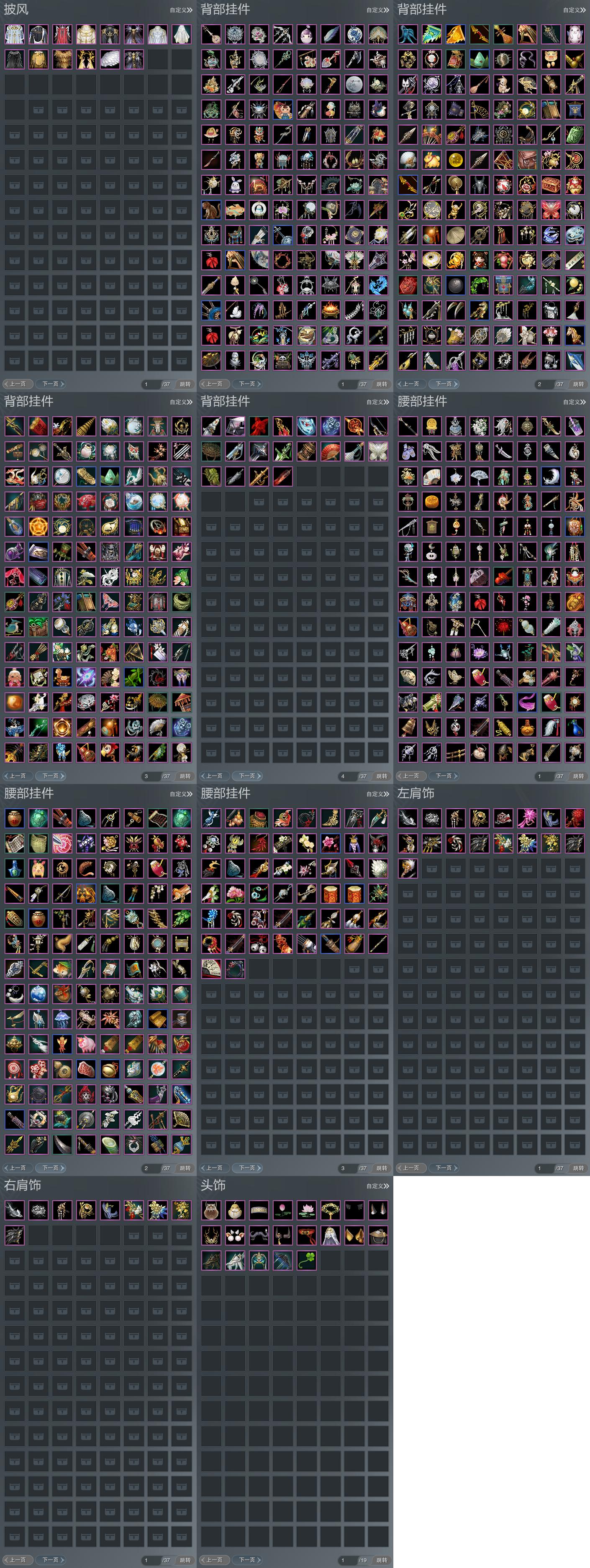 【肩饰】17左,9右,[双鱼曳波·无量·左, 绝代仙·墨楼·左, 一念莲华·左, 广漠听星·左, 云中雪霁·左, 剑歌惊月·左][绝代仙·墨楼·右, 一念莲华·右, 广漠听星·右, 云中雪霁·右, 剑歌惊月·右]