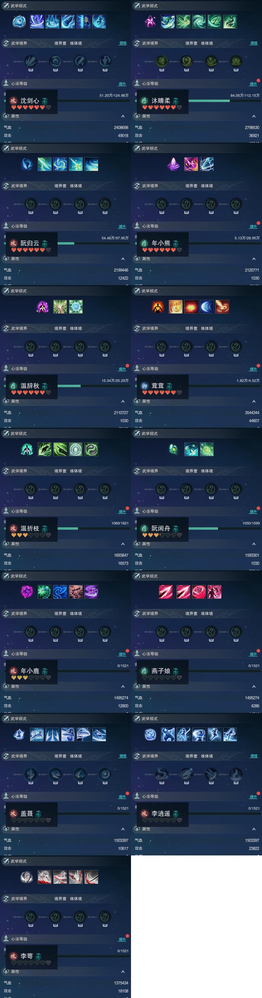 【同伴】沈剑心87级境界壹,沐晴柔85级境界壹,阮归云84级境界壹,年小熊75级境界壹,温辞秋74级境界壹,茸茸志61级境界壹,温折枝25级境界壹,阮闲舟13级境界壹,年小鹿1级境界壹,燕子娘1级境界壹,盖聂志1级境界壹,李逍遥1级境界壹,李萼志1级境界壹