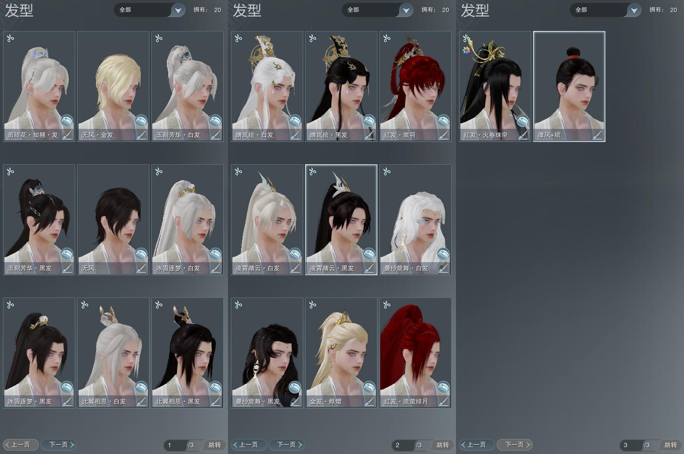【发型】金发3个[资历金, 猪金, 无风金发], 红发3个[六红, 十红, 小资历红], 黑发7个, 白发7个, 盒子发型[丝路黑, 踏云黑发, 晴岚绘黑发, 丝路白, 踏云白发, 五代七夕黑发, 晴岚绘白发, 五代七夕白发, 花滑黑发, 花滑白发], 总页数3