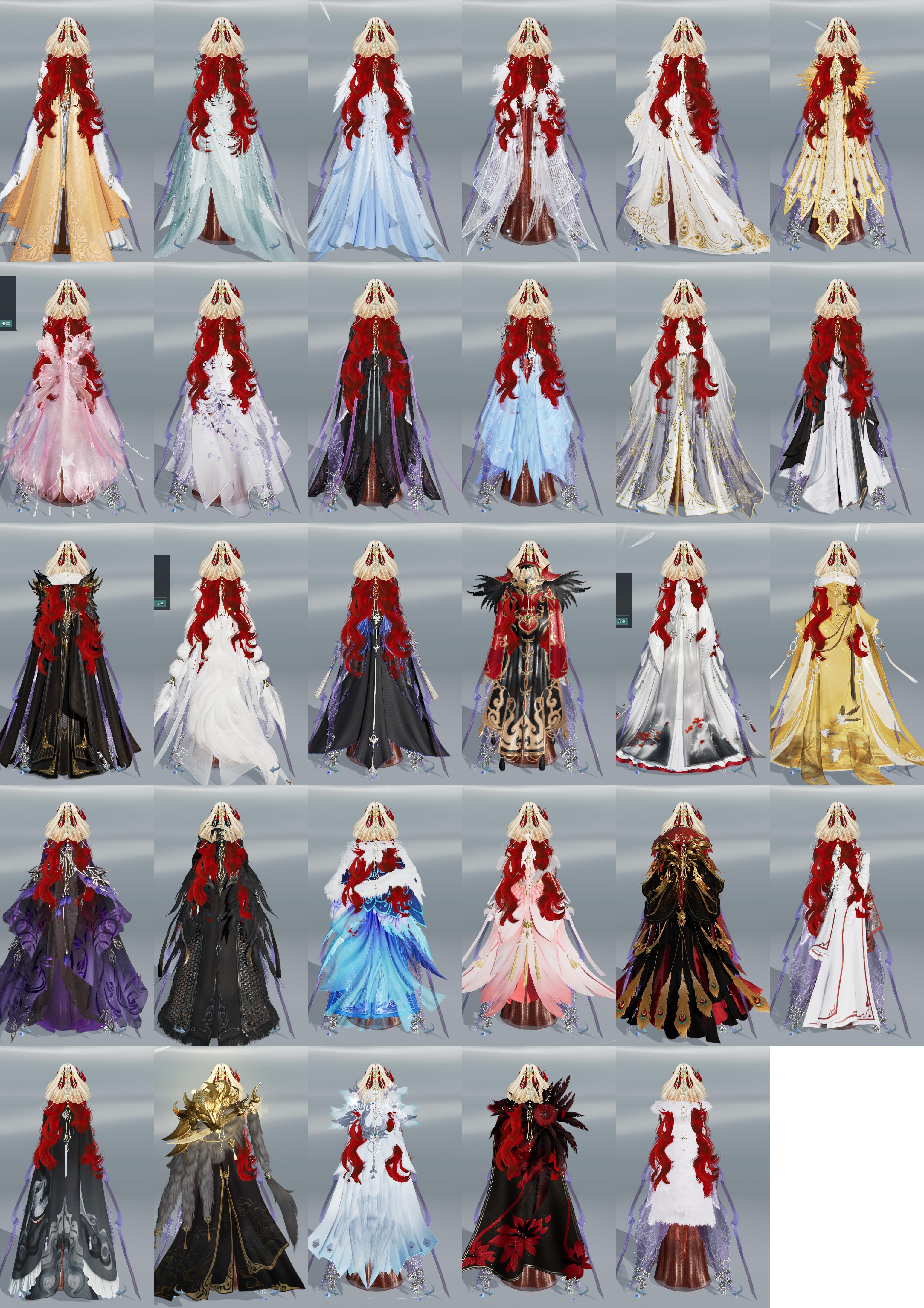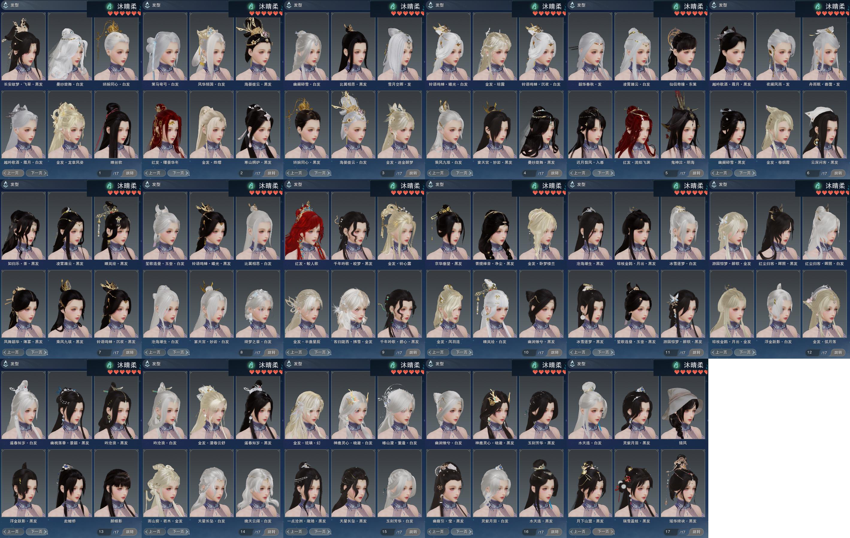 【发型】金发29个[一代金, 狐金, 兔金, 资历金, 鼠金, 猪金, 珊瑚金, 角金, 凤金, 时光金, 牛金, 巴卡金, 云金, 凤仙金, 双十二金发, 女仆金, 雪金, 海金, 龙金, 铃金, 玄江金发, 精灵金, 翎金, 金发奉清茗, 澄琼枝金发, 蓝游园金发, 紫雨山前金发, 蓝龙隐金发, 白陇西金发], 红发14个[四红, 五红, 八红, 九红, 凤仙粉, 蝶粉, 猴红, 小资历红, 大资历红, 十五红, 蛇红, 绿寻香红发, 雪漠飞绫红发, 三代灰银], 黑发74个, 白发48个, 盒子发型[丝路黑, 狄仁杰黑, 二代七夕白, 一代花朝白白, 踏云黑发, 四代七夕黑发, 四代中秋蓝黑发, 黑端午白发, 狄仁杰白, 雪月白发, 晴岚绘黑发, 白楼兰黑发, 黑楼兰黑发, 丝路白, 白如归黑发, 踏云白发, 四代七夕白发, 四代中秋蓝白发, 幽阑黑发, 二代乘风黑发, 五代七夕黑发, 晴岚绘白发, 白楼兰白发, 墨心黑发, 黑楼兰白发, 净尘黑发, 幽阑白发, 二代乘风白发, 五代七夕白发, 薄雾黑发, 蓝曲塘黑, 澄琼枝黑发, 墨心白发, 沧海黑发, 唐风玉壶黑发, 黑红尘黑发, 黑狮黑发, 蓝游园黑发, 蓝曲塘白, 蓝幽香黑发, 沧海白发, 唐风玉壶白发, 小金龙黑发, 黑红尘白发, 黑狮白发, 竹笛黑发, 小金龙白发, 红六七黑发, 竹笛白发, 红六七白发, 红梅盒黑发, 花滑黑发, 红梅盒白发, 花滑白发, 幽涧愀兮白发, 绿幽昙白发, 蓝椿山白发, 蓝沧洲盒黑发, 白幽馥黑发, 天星盒黑发, 游龙盒黑发, 婚纱盒黑发, 天星盒白发, 粉鹿黑发, 蓝观灯盒黑发, 游龙盒白发, 茄盒黑发, 婚纱盒白发, 粉鹿白发, 茄盒白发, 九七黑发, 青蛇盒黑发, 白蛇盒黑发, 梦盒白发, 蓝上火黑发, 瑞雪盒黑发, 蓝寻香黑发, 绿寻香黑发, 瑶华盒黑发, 绿故梦黑发, 仙剑黑发, 潮涌盒黑发, 络羽黑发, 仙剑白发, 络羽白发, 紫天山黑发, 蓝毛衣黑发, 华灯夕雪黑发], 总页数9