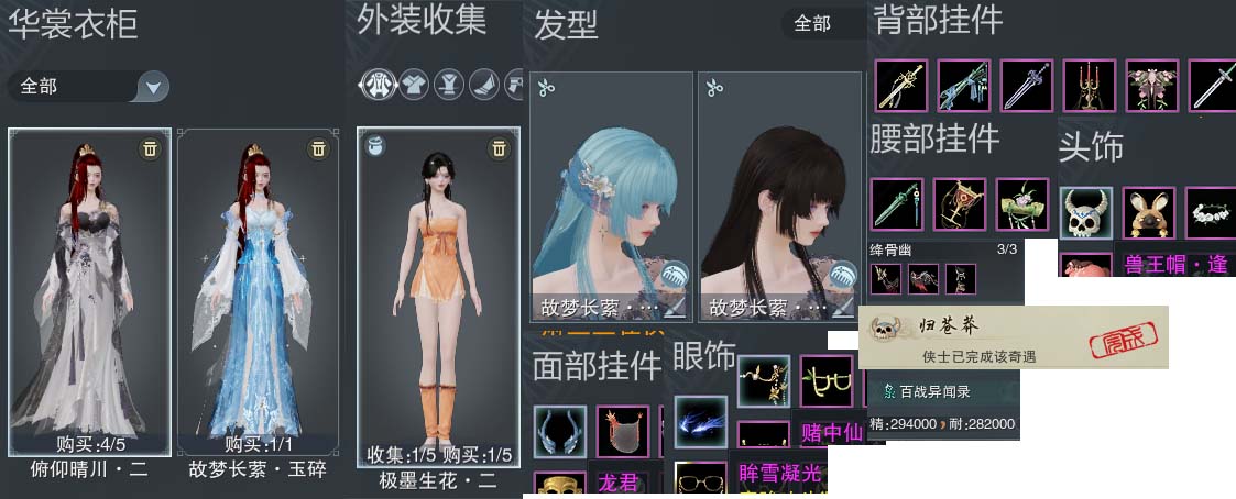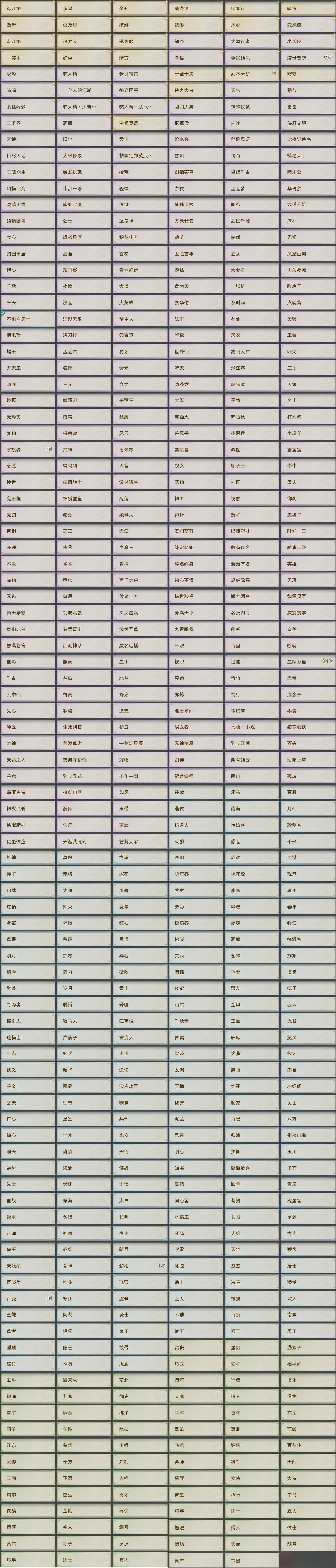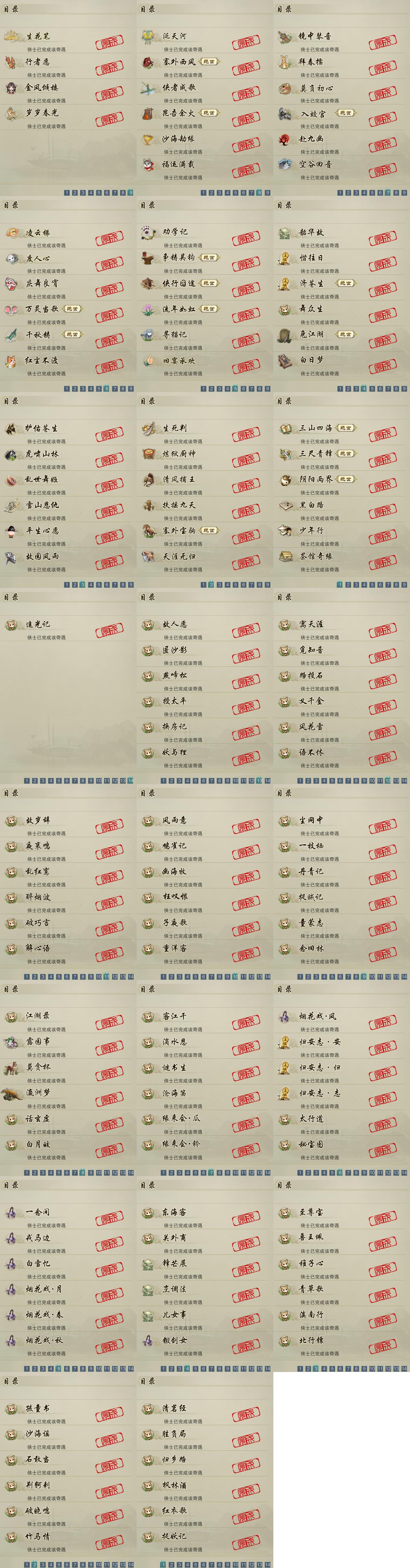 【奇遇】50个[白日梦, 天涯无归, 三山四海, 劝学记, 雪山恩仇, 阴阳两界, 莫负初心, 兔江湖, 平生心愿, 黑白路, 惜往日, 乱世舞姬, 塞外宝驹, 争铸吴钩, 韶华故, 虎啸山林, 济苍生, 护佑苍生, 少年行, 故园风雨, 扶摇九天, 三尺青锋, 流年如虹, 舞众生, 清风捕王, 侠行囧途, 寻猫记, 茶馆奇缘, 入蛟宫, 庆舞良宵]