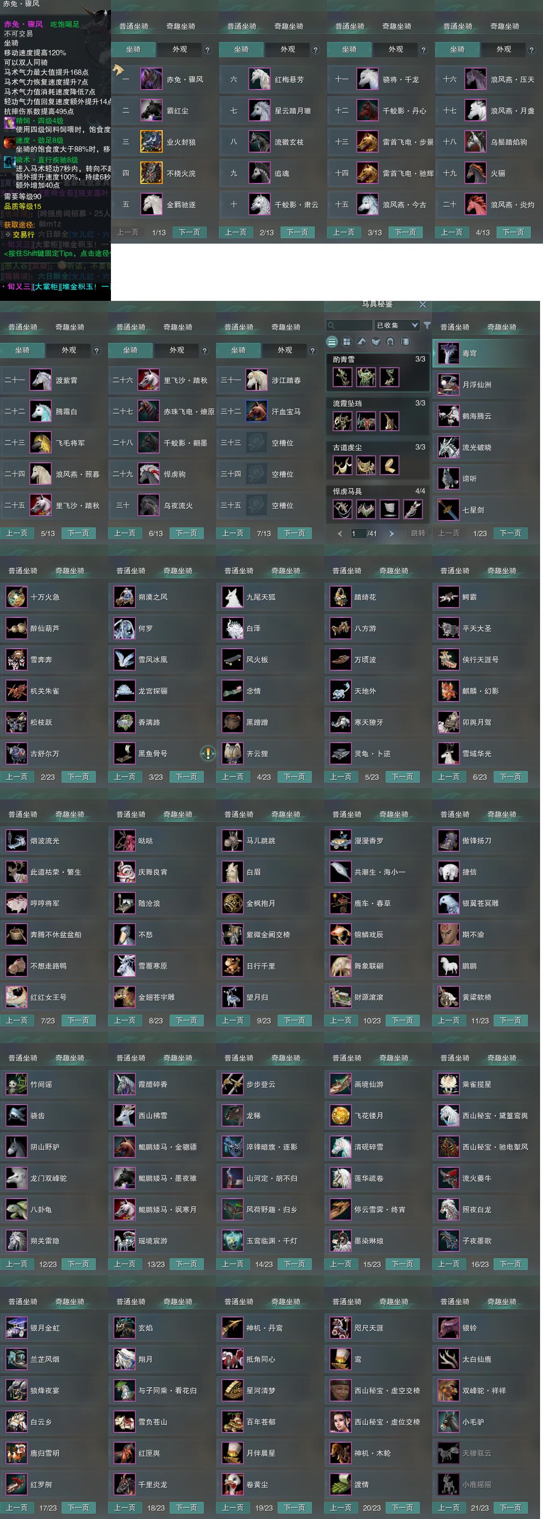 【坐骑】32个[赤珠燎原, 恶人火兽, 阵营狼, 星云踏月骓, 飞毛将军, 里飞沙踏秋, 里飞沙踏秋, 劲足赤兔骤风, 黑马, 红马, 金羁驰逐, 肃云, 翻墨, 千蛟影丹心, 浪风燕今古, 骁将千龙, 霸红尘, 雷首飞电步景, 雷首飞电驰辉, 乌鬃踏焰驹]