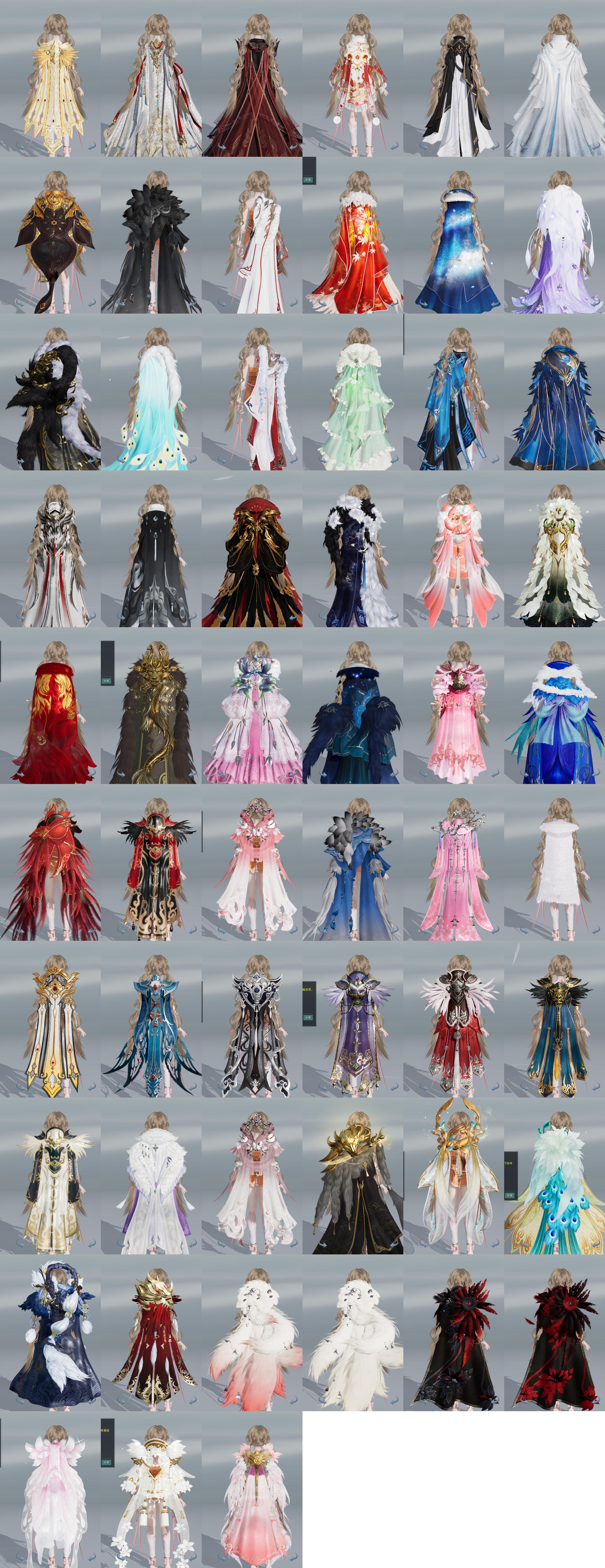 【披风】65个,[刀宗预热披风, 衍天预热披风, 天火之眼, 红盒子披风, 7W资历披风, 雪啸刚风, 熔金烈风, 狐狸毛, 狐狸毛, 一代恶人, 情R枕, 六翼, 14W资历披风, 战服浩气, 蓝盒子披风, 战服恶人, 青盒子披风, 三山披风, 唐盒子披风, 白盒子披风, 一代粉, 二代白, 二代紫, 二代粉, 二代红, 蓬莱盒子披风, 二代蓝, 二代黑, 三代蓝, 三代粉, 三代银黑, 三代黄, 周公御龙, 金鱼, 特效粉, 孔雀披风, 暗夜, 暗夜, 钰瓣, 钰瓣, 狼头, 白赵云披风, 火鸡毛, 山樱语, 素玉, 星空, 龙头, 红凤凰, 兔子, 迷星黯渊, 几度春, 征鸿点苍, 八周黑, 八周年孔雀, 新星空, 枫叶, 团绒戏]