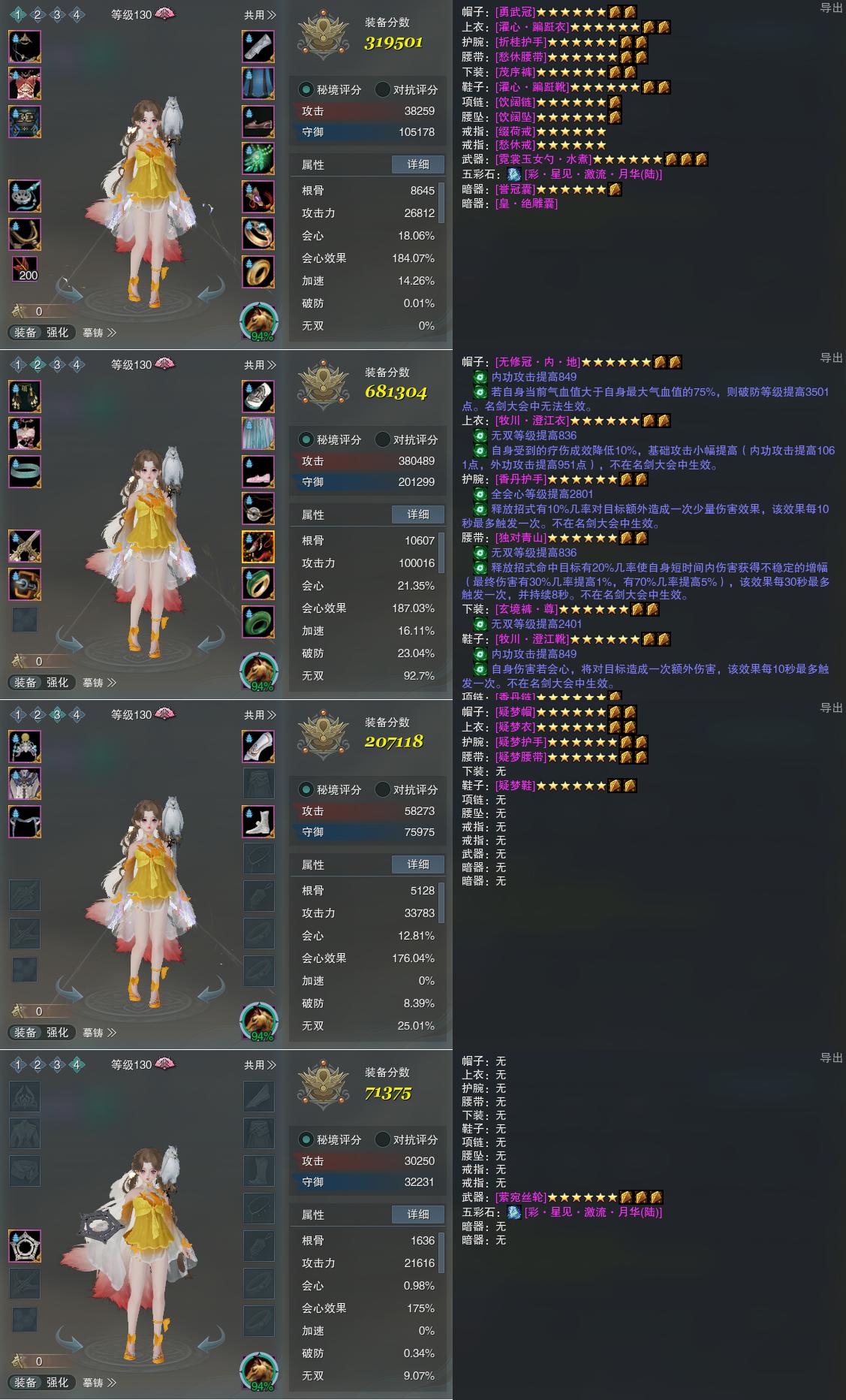 【装备】130级,装备一319501,冰心诀PVE681304,装备三207118,装备四71375
