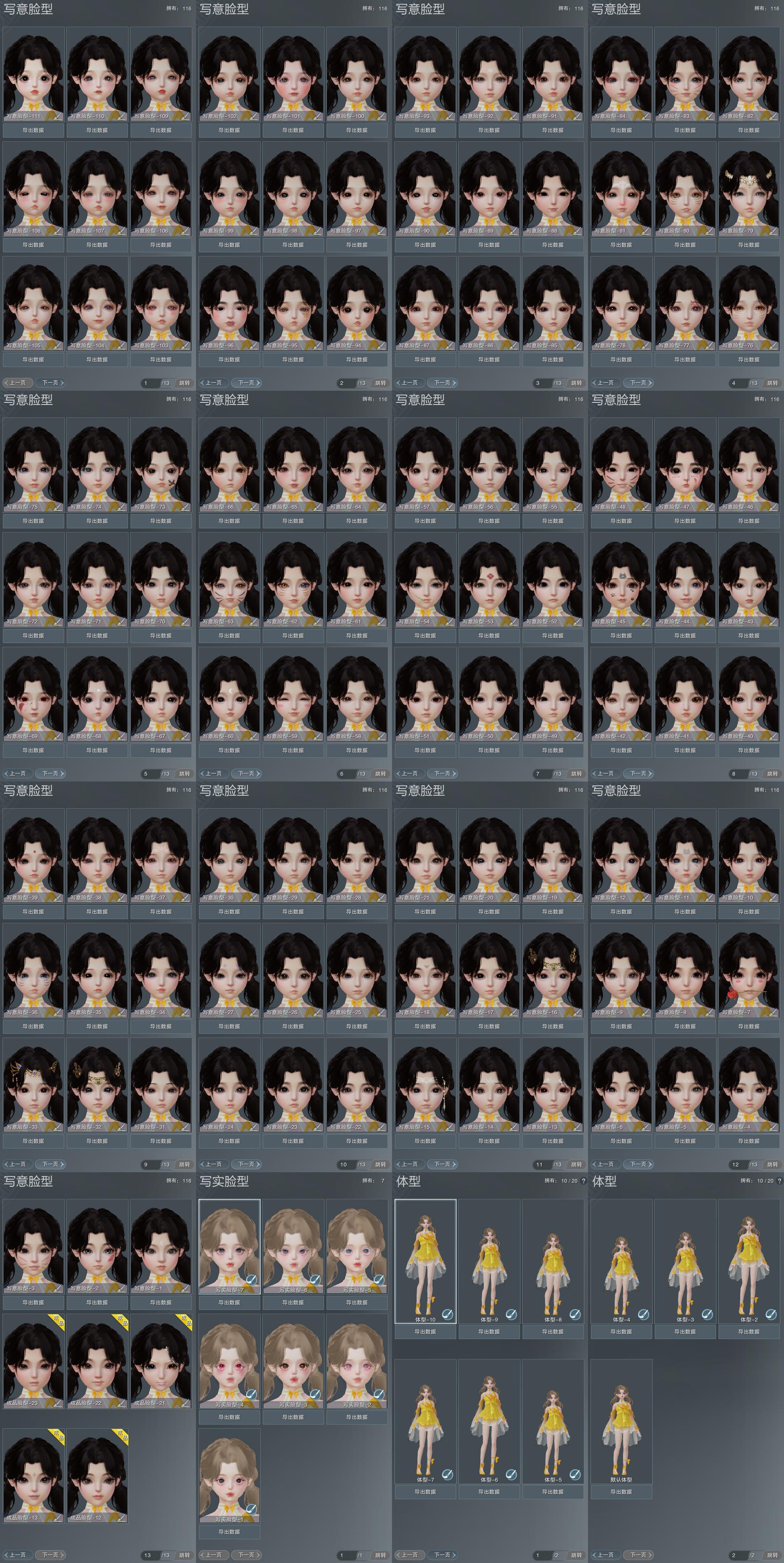【捏脸】写意脸型116个,写实脸型7个,体型10个