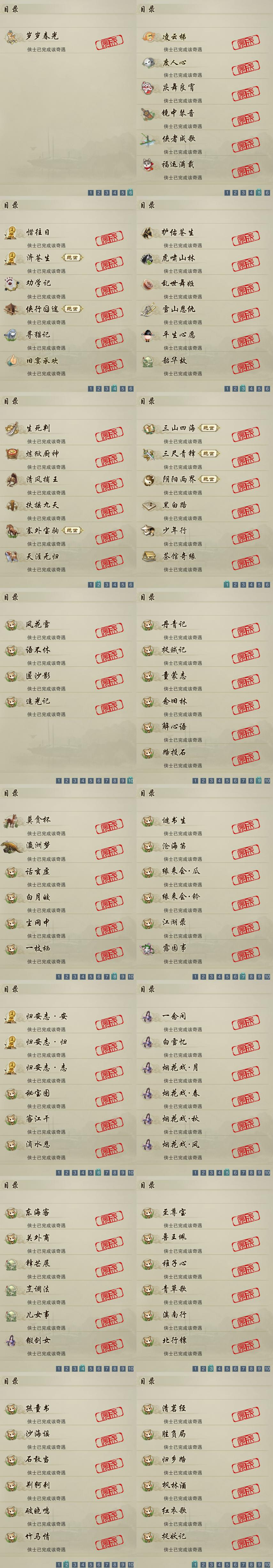【奇遇】30个[天涯无归, 三山四海, 劝学记, 雪山恩仇, 阴阳两界, 平生心愿, 黑白路, 惜往日, 乱世舞姬, 塞外宝驹, 虎啸山林, 韶华故, 济苍生, 护佑苍生, 少年行, 扶摇九天, 三尺青锋, 清风捕王, 侠行囧途, 寻猫记, 茶馆奇缘, 庆舞良宵, 生死判, 凌云梯, 炼狱厨神, 度人心, 旧宴承欢, 镜中琴音, 侠者成歌, 福运满载]