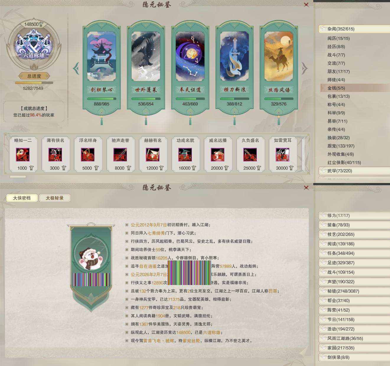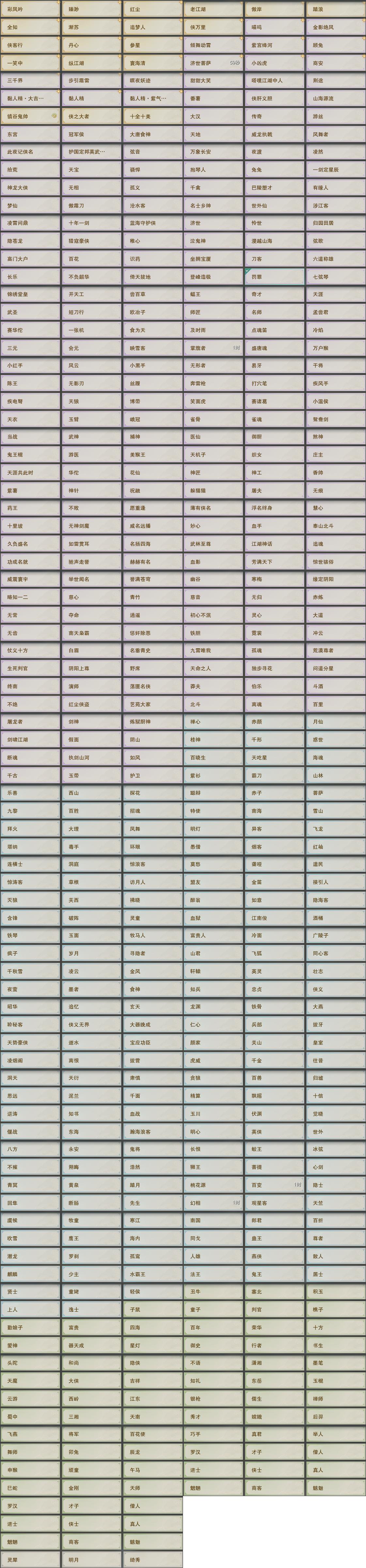 【称号】[济世菩萨, 紫宫绛河, 纵江湖, 侠万里, 倾舞动霄, 凶虎, 小凶虎, 顾兔]