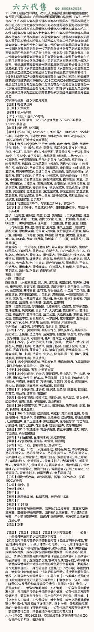 【如角色内详情内容多于详情截图内容(包括且不限于外观/背包/挂件等内容),不属于详情不符范畴,不可以此作为退单理由;号上背包/不绑定物品/通宝/积分默认清理,拓印件数包括成就成衣件数,成衣总数包括限时限量数量,帮会坐骑不随号一起出;如果在意狐狸毛披风的颜色(包括上部颜色和下部颜色和饰品颜色等,由于游戏画质设置/游戏内光线/显示器分辨率影响,会造成详情截图中外观与部件的颜色显示色差问题,此问题不可作为退单理由)、身份证信息(重置/过户/双非等)等重要内容,请务必仔细询问客服,付款后即表示悉知并接受当前账号内情况,不可以此作为退单理由!如果在意【工作服等不想要的外观(因为删除外观无法显示在截图中)】剩余点卡、分离、转服、阵营CD以及战阶和竞技场段位情况(截图为上架时情况,之后可能变动),请详细询问客服,如不询问,一切以账号当前情况为准,并且表示接受此号目前详情内情况,如在付款后发现有详情不符,需买家自行负责;只出角色不包括积分、通宝等。】