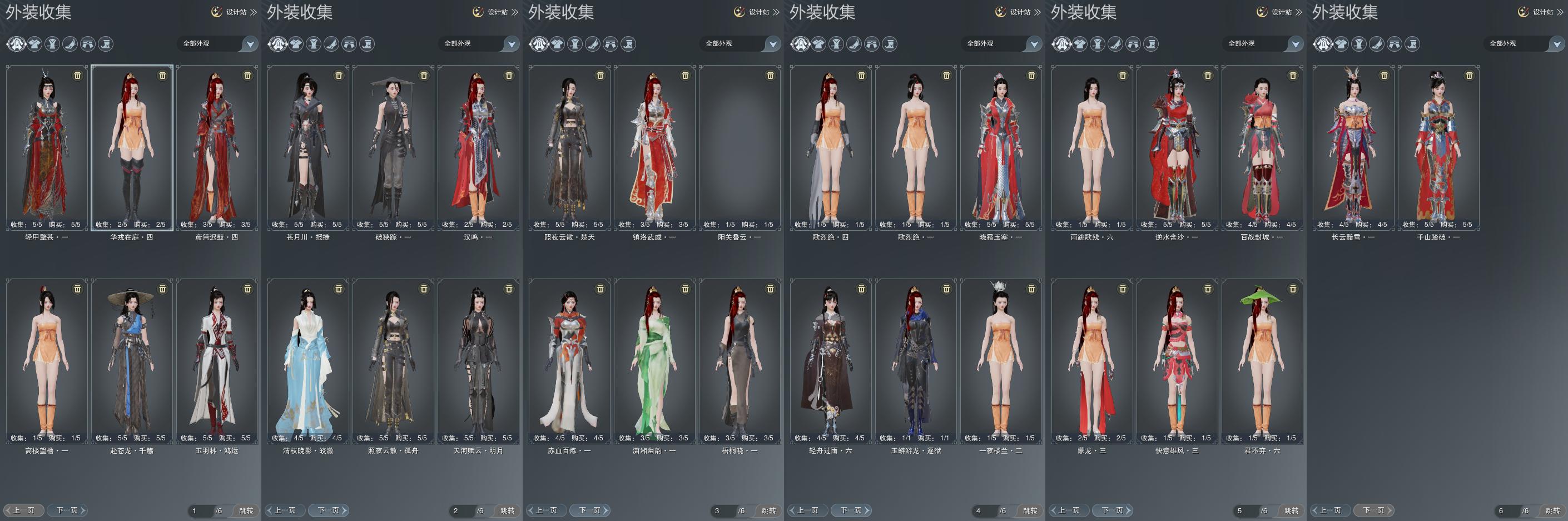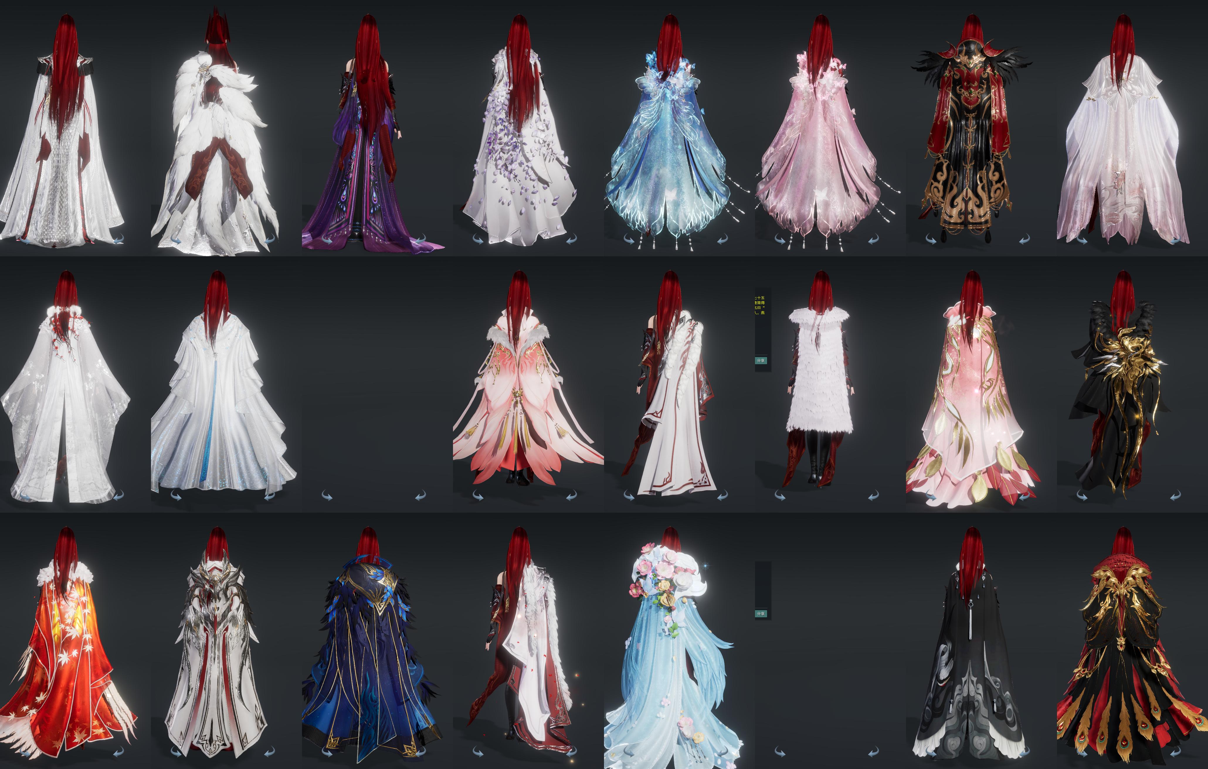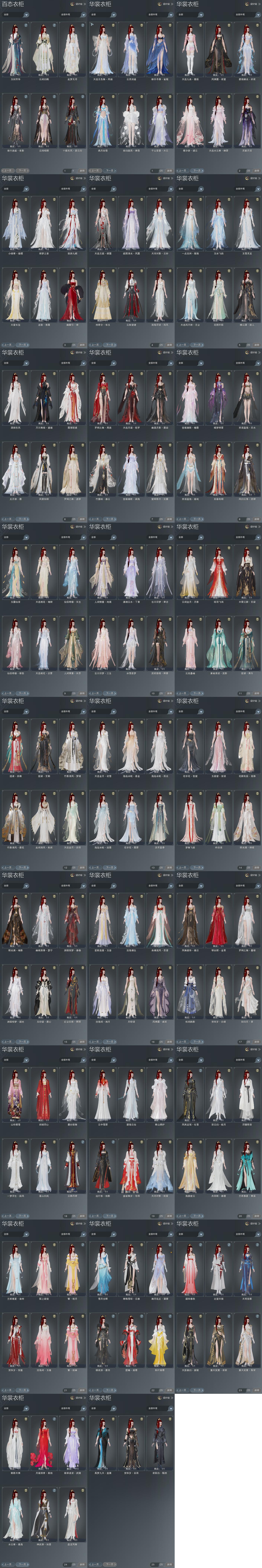 限时限量:[水云寒桑海, 蓝九天, 红玫瑰, 微草武陵, 黑天涯, 红舞步, 重天梨棠, 重天夜歌, 霆螭凝霜, 锦夜游墨羽, 踏月濯香, 兰若渝州, 兰若青溪, 寒梅日暮, 烟花套, 琴台顾金粟, 十二周年工作服, 玉悬窗棠语, 客行逍遥夜影, 小黑龙衣, 流夜辉墨, 一期福袋成衣, 黑泳衣, 蓝泳衣, 十三周年成衣, 蓝水母, 粉水母, 天河对影云砂, 万川青绿黛瑾, 蓝浪海, 云闲归鹤, 紫清光, 蓝碧海]
