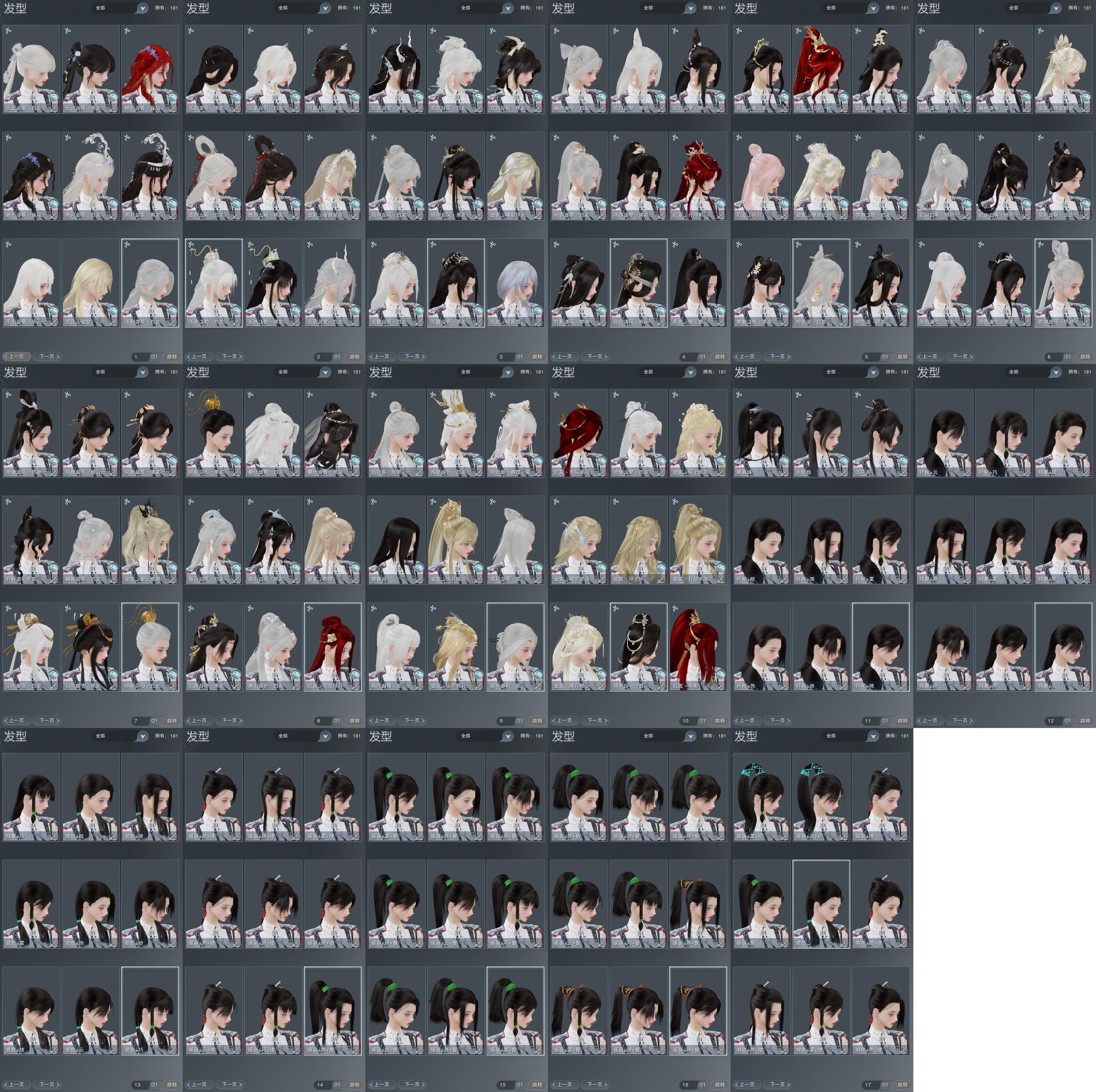 【发型】金发14个[狐金, 资历金, 鸡金, 喵金, 考金, 国金, 倒闭金, 猪金, 苍金, 牛金, 云金, 雪金, 蔷薇金, 玄江金发], 红发8个[五红, 八红, 十二红, 凤仙粉, 虎红, 小资历红, 蓝寻香红发, 一代灰], 黑发38个, 白发32个, 盒子发型[二代花朝黑, 丝路黑, 二代七夕白, 一代重阳白, 一代花朝白白, 四代七夕黑发, 狄仁杰白, 雪月白发, 山吹樱雪黑发, 棉袄白, 二代花朝白, 丝路白, 四代七夕白发, 山吹樱雪白发, 幽阑白发, 月轻语黑发, 薄雾黑发, 晚日黑发, 红曲塘黑, 沧海黑发, 唐风玉壶黑发, 黑红尘黑发, 红曲塘白, 原色幽香黑发, 沧海白发, 黑红尘白发, 竹笛黑发, 小熊黑发, 原色幽香白发, 竹笛白发, 小熊白发, 竹影梦境黑发, 原色异域黑发, 花滑黑发, 紫忘川黑发, 花滑白发, 山海黑发, 紫忘川白发, 山海白发, 幽涧愀兮白发, 卿酒盒黑发, 踏青黑发, 卿酒盒白发, 灵龙盒黑发, 蓝兔盒黑发, 踏青白发, 灵龙白发, 蓝兔盒白发, 游龙盒黑发, 游龙盒白发, 茄盒黑发, 茄盒白发, 燕月盒黑发, 白千山白发, 蓝寻香黑发, 燕月盒白发, 仙剑黑发, 仙剑白发], 总页数17