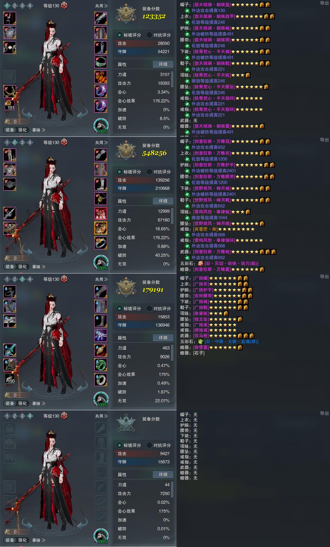 【装备】130级,装备一123352,傲血战意PVP548256,装备三179191,装备四0