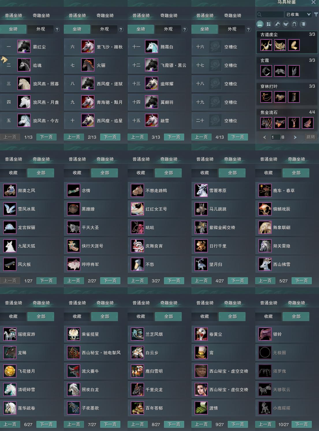 【坐骑】15个[西风瘦逐狱, 西风瘦追星, 青海骢黯月, 飞霞骠黑云, 里飞沙踏秋, 浪风燕今古, 霸红尘]