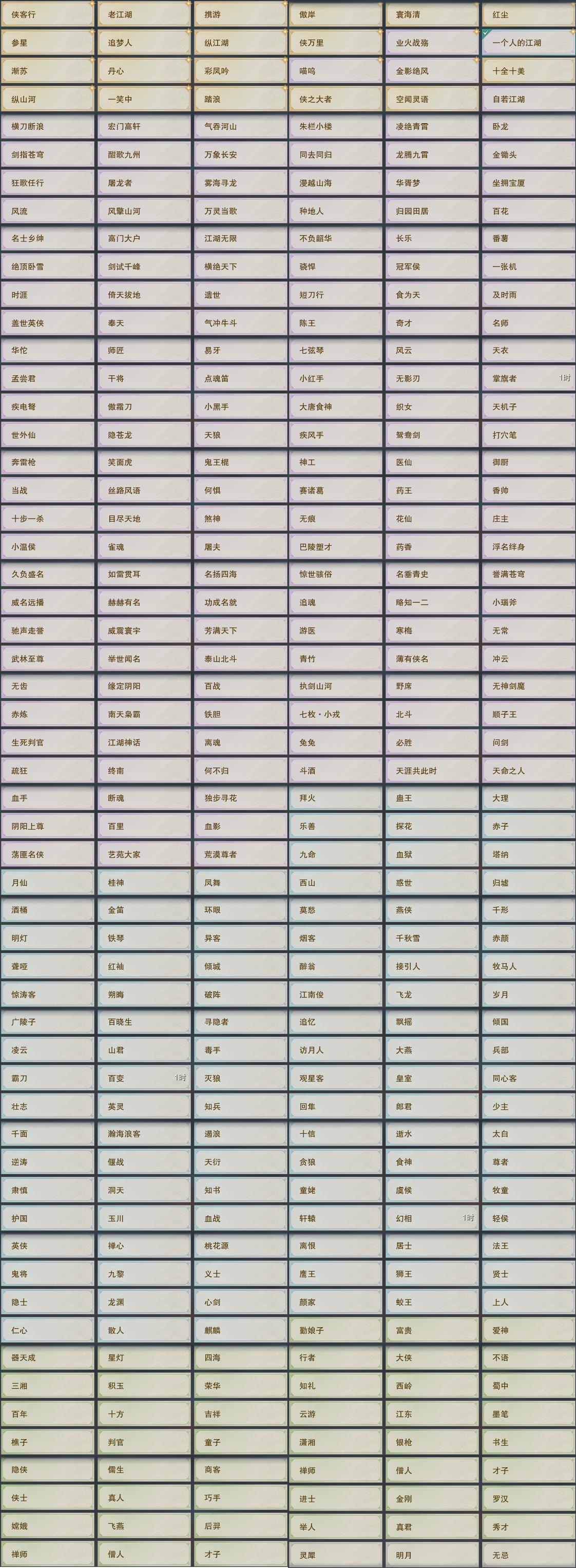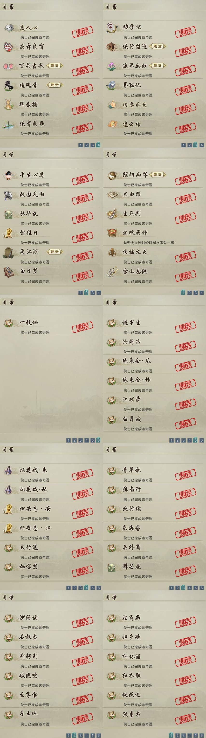 【奇遇】24个[白日梦, 劝学记, 阴阳两界, 雪山恩仇, 平生心愿, 兔江湖, 黑白路, 惜往日, 韶华故, 故园风雨, 扶摇九天, 流年如虹, 侠行囧途, 寻猫记, 庆舞良宵, 万灵当歌, 生死判, 凌云梯, 炼狱厨神, 度人心, 追魂骨, 旧宴承欢, 侠者成歌, 拜春擂]