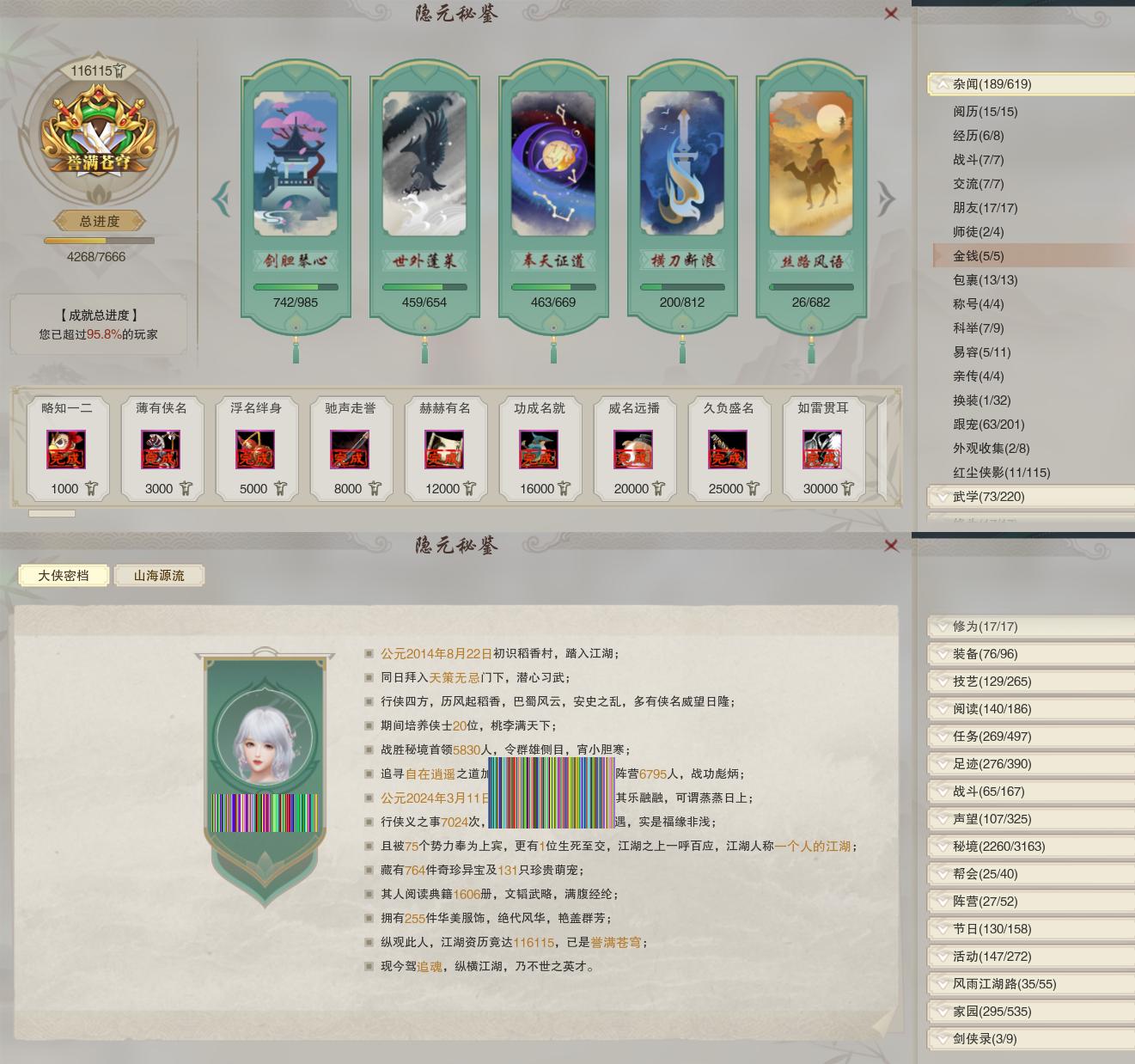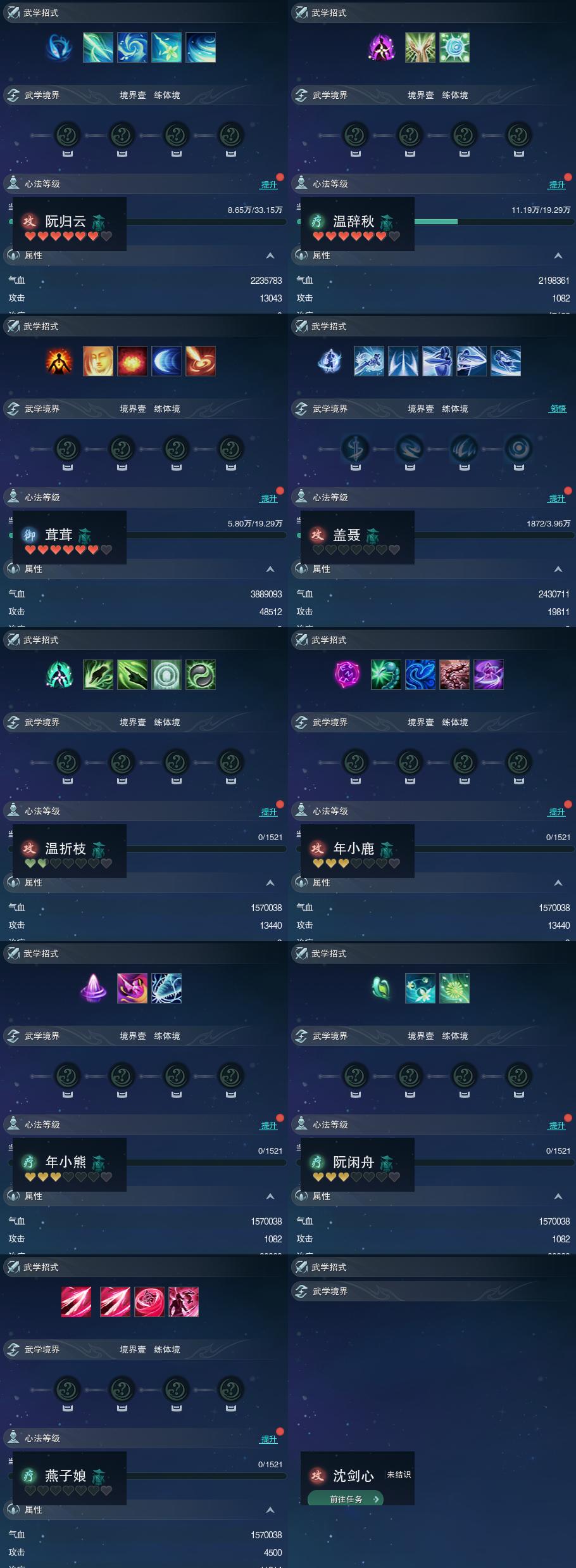 【同伴】阮归云76级境界壹,温辞秋72级境界壹,茸茸志72级境界壹,盖聂志60级境界壹,温折枝1级境界壹,年小鹿1级境界壹,年小熊1级境界壹,阮闲舟1级境界壹,燕子娘1级境界壹,沈剑心级