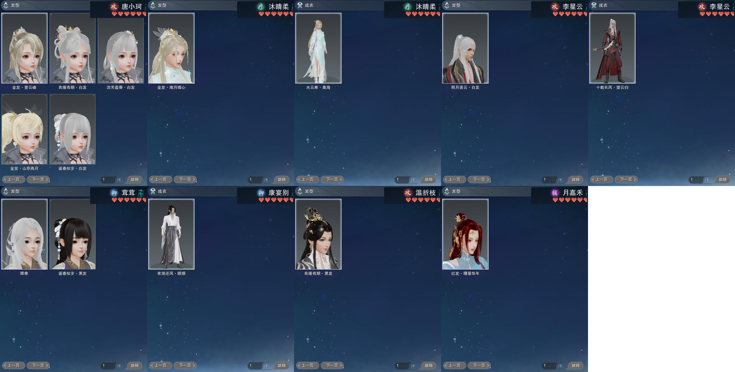 【发型】金发4个[狐金, 国金, 三代金, 白龙隐金发], 红发1个[猴红], 黑发7个, 白发7个, 盒子发型[六代中秋黑发, 六代中秋白发, 蝴蝶黑发, 红梅盒黑发, 蝴蝶白发, 红梅盒白发, 七七黑发, 七七白发, 幽涧愀兮白发, 黑幽馥黑发], 总页数1