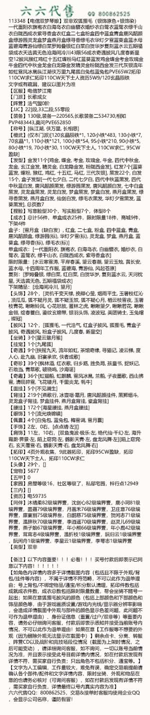 【如角色内详情内容多于详情截图内容(包括且不限于外观/背包/挂件等内容),不属于详情不符范畴,不可以此作为退单理由;号上背包/不绑定物品/通宝/积分默认清理,拓印件数包括成就成衣件数,成衣总数包括限时限量数量,帮会坐骑不随号一起出;如果在意狐狸毛披风的颜色(包括上部颜色和下部颜色和饰品颜色等,由于游戏画质设置/游戏内光线/显示器分辨率影响,会造成详情截图中外观与部件的颜色显示色差问题,此问题不可作为退单理由)、身份证信息(重置/过户/双非等)等重要内容,请务必仔细询问客服,付款后即表示悉知并接受当前账号内情况,不可以此作为退单理由!如果在意【工作服等不想要的外观(因为删除外观无法显示在截图中)】剩余点卡、分离、转服、阵营CD以及战阶和竞技场段位情况(截图为上架时情况,之后可能变动),请详细询问客服,如不询问,一切以账号当前情况为准,并且表示接受此号目前详情内情况,如在付款后发现有详情不符,需买家自行负责;只出角色不包括积分、通宝等。】
