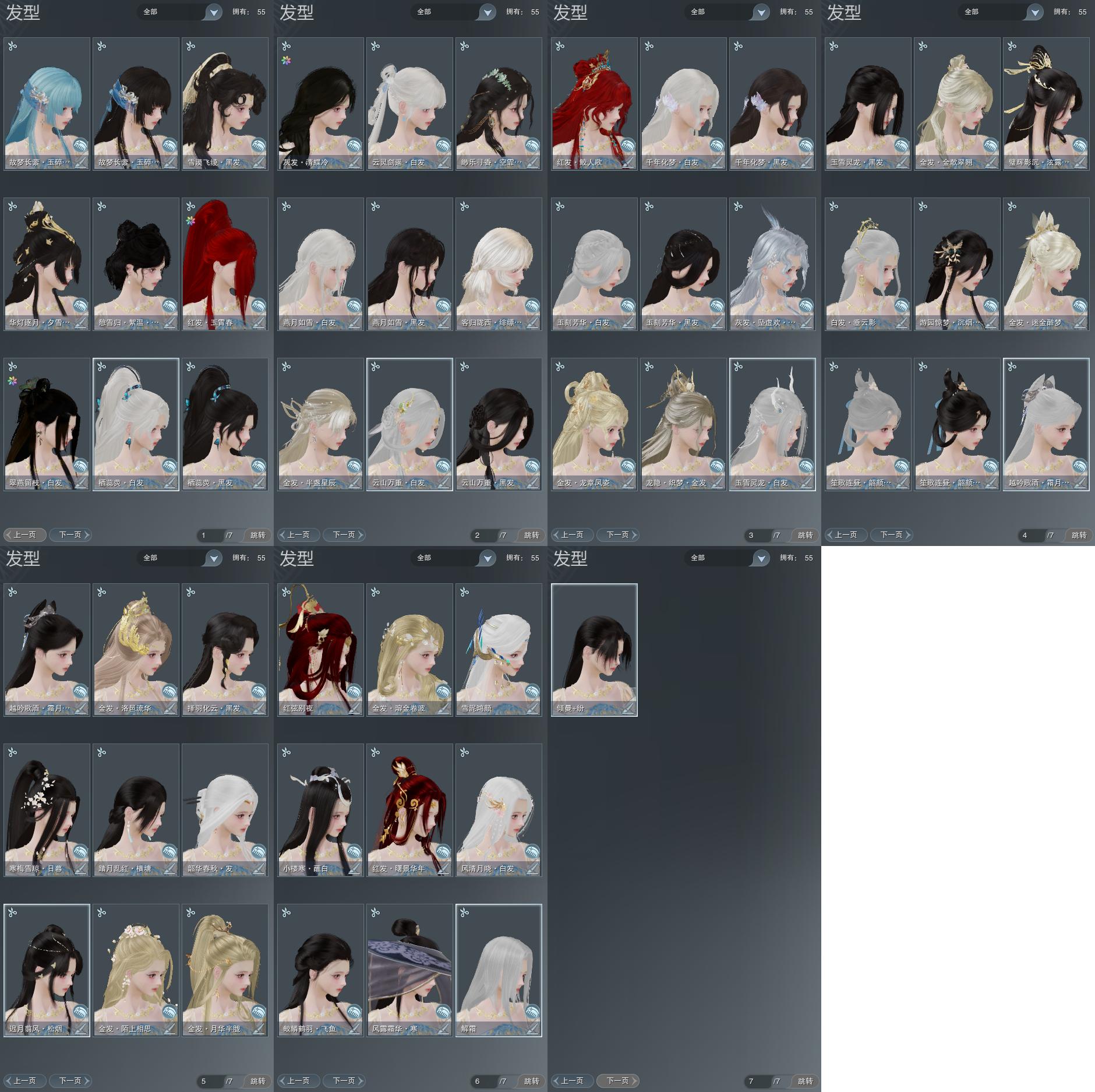 【发型】金发11个[鸡金, 蝶金, 考金, 玫瑰金, 牛金, 四代中秋金, 龙金, 玄江金发, 精灵金, 白龙隐金发, 粉陇西金发], 红发7个[蓝葵蓝发, 蝶粉, 猴红, 鸡红, 十五红, 马红, 三代灰银], 黑发22个, 白发15个, 盒子发型[一代七夕白, 二代七夕白, 四代中秋蓝黑发, 四代中秋蓝白发, 唐风韶颜黑发, 绿游园黑发, 唐风韶颜白发, 七中白盒黑发, 灵龙盒黑发, 灵龙白发, 梦盒黑发, 梦盒白发, 燕月盒黑发, 绿寻香黑发, 燕月盒白发, 仙剑白发, 绿毛衣黑发, 华灯夕雪黑发, 蓝葵黑发], 总页数7