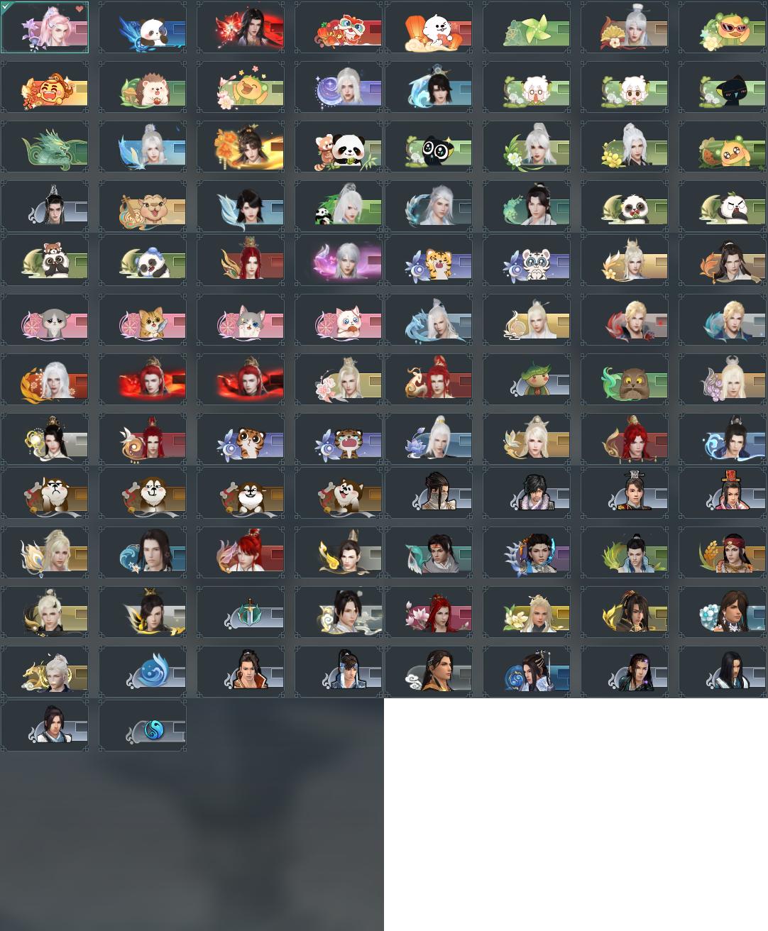 盒子:[黑盒, 雪月盒, 松间盒(豪), 狄盒, 猫盒(缺白发), 喵盒, 一七盒, 猪盒, 棋盒, 二七盒, 三七盒, 二代万花盒, 四代七夕盒, 蘑菇盒, 粉盒, 五七盒, 一代乘风盒, 二代粉盒, 二代乘风盒, 蓝盒, 一中粉盒, 蓬莱盒, 灯盒, 白菩提盒(豪), 青盒, 苍盒, 二代元宵盒, 丐盒, 迷金盒, 牛盒, 澡盒, 新青盒, 刀宗盒, 三代元宵盒, 沧海盒, 白四元盒, 五中粉盒, 黑狮盒, 白狮盒, 红六七盒, 六中盒, 小金龙盒, 七七盒, 七中黄盒, 竹笛盒, 七中白盒, 小熊盒, 龙盒, 孔雀盒, 二胡盒, 柿盒, 五代绿重阳盒, 蓝蝴蝶盒, 五代紫重阳盒(缺背挂), 十七盒, 蓝异域盒, 绿水袖盒, 书盒, 蓝水袖盒(缺背挂), 蓝琵琶盒, 黑海岛(豪), 虎盒, 蝴蝶盒, 红梅盒, 花滑盒, 星源盒, 灰竹影(豪), 白忘川盒, 红竹影衣(豪), 古琴盒, 星辰盒, 羊盒, 狼盒, 山神盒, 二代毒盒, 曲江盒, 雏菊盒, 镖盒, 兔盒, 咩盒, 紫人间盒(豪), 扇盒, 苍二盒, 不良人盒, 红白妖龙盒(标), 莲华盒, 灵龙盒, 虹猫盒, 金幽昙(豪), 圆舞盒, 策二盒, 西游盒, 黑傣族盒(豪), 金持君令(豪), 八七盒, 白中秋盒, 六代重阳盒, 万灵盒, 青山盒, 白幽馥(标), 紫幽馥(标), 红幽馥(标), 黑幽馥(标), 蓝幽馥(标), 白龙隐(豪), 天星盒, 红香盒, 游龙盒, 海阔盒, 熊猫盒, 九七盒, 兰陵盒, 白蛇盒, 镰刀盒, 燕月盒, 墨龙盒, 络羽盒, 瑶台仙梦礼盒, 魔镜盒, 蓝葵盒, 灰陇西(标), 蓝问刀(标), 白浮光(标), 白天山(豪), 粉毛衣(豪), 白赵云盒]