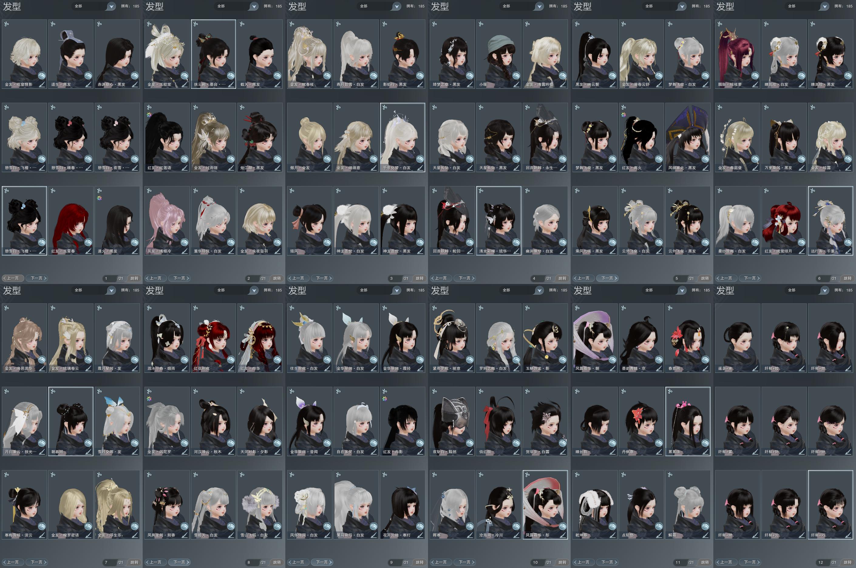 【发型】金发17个[猴金, 资历金, 鼠金, 喵金, 龙女金, 玫瑰金, 珊瑚金, 云金, 水母金, 咩金, 傲月金发, 蛇金, 永夜金, 翎金, 七中金发, 狸金, 蓝毛衣金发], 红发9个[五红, 七红, 紫发, 蝶粉, 鸡红, 小资历红, 大资历红, 十六红, 马红], 黑发51个, 白发27个, 盒子发型[狗白, 白端午白发, 乘风黑发, 晴岚绘黑发, 雪月白发, 蓝腿白, 丝路白, 飞皇黑发, 二代乘风黑发, 五代七夕黑发, 晴岚绘白发, 飞皇白发, 二代乘风白发, 五代七夕白发, 小熊黑发, 小熊白发, 幽涧愀兮白发, 蓝钻石盒黑发, 红黑妖眸盒黑发, 棕黑妖眸盒黑发, 天星盒黑发, 婚纱盒黑发, 天星盒白发, 熊猫黑发, 熊猫白发, 镰刀黑发, 梦盒白发, 燕月盒白发, 黑战国黑发, 红毛衣黑发, 粉毛衣黑发, 蓝毛衣黑发], 总页数13
