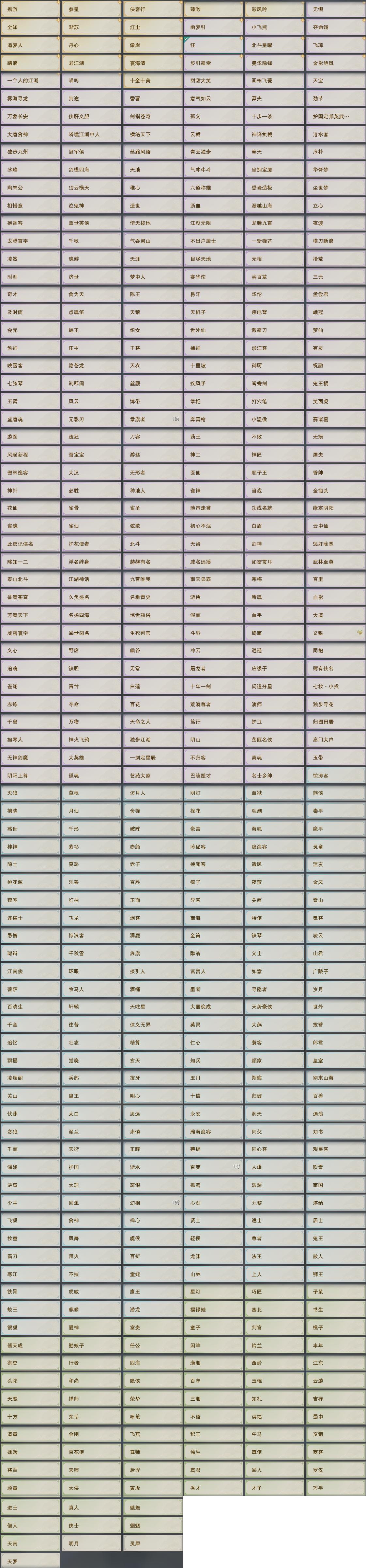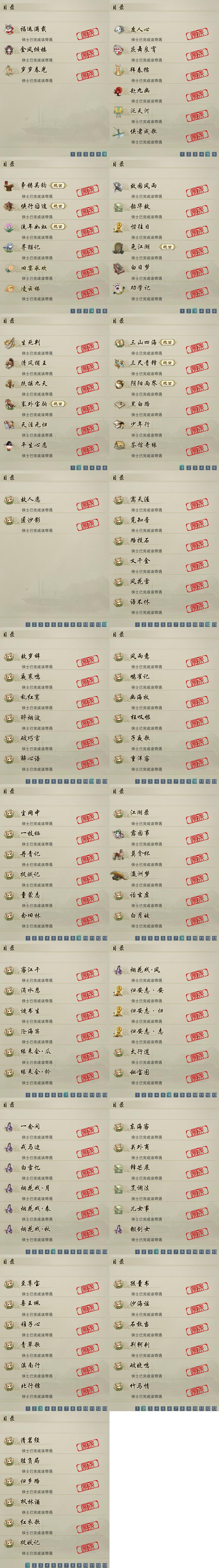 【奇遇】32个[白日梦, 天涯无归, 三山四海, 劝学记, 阴阳两界, 兔江湖, 平生心愿, 黑白路, 惜往日, 塞外宝驹, 争铸吴钩, 韶华故, 少年行, 故园风雨, 扶摇九天, 三尺青锋, 流年如虹, 清风捕王, 侠行囧途, 寻猫记, 茶馆奇缘, 庆舞良宵, 生死判, 凌云梯, 度人心, 赴九幽, 旧宴承欢, 泛天河, 侠者成歌, 拜春擂]