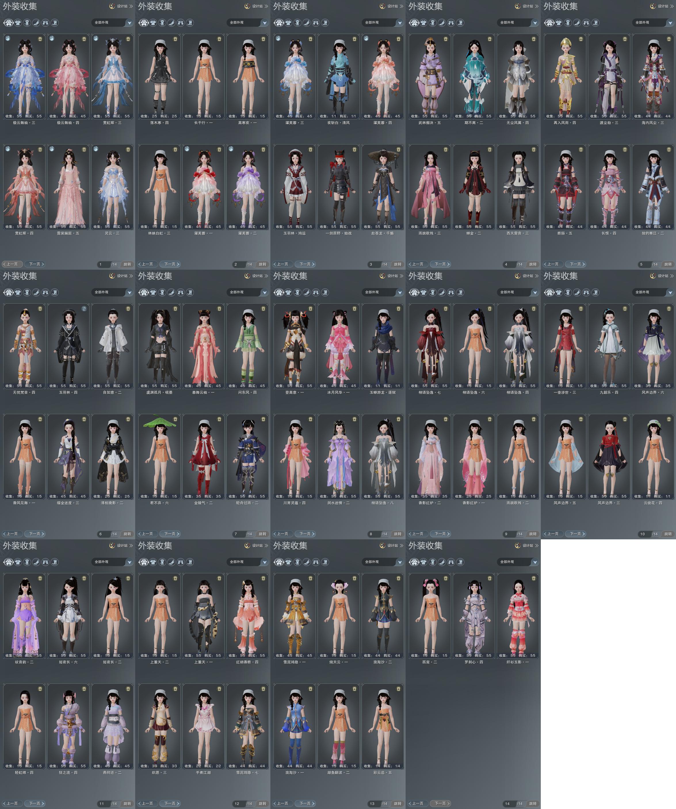 限时限量:[白九壤, 明镜高悬, 富婆套, 黄九壤, 打歌服, 水云寒写晖, 蓝九壤, 兰庭凤香, 兰庭新翠, 红云飞, 重华绯仪, 兰庭冷绣, 海韵小调, 蓝沐云, 黑九天, 红玫瑰, 月寒庭兰, 雪衣寒川, 紫九天, 黄玫瑰, 红长天, 绿长天, 微草团浓, 牵云红梅, 粉封川, 天涯空亭, 紫封川, 牵云雪舟, 红舞步, 重天飞笙, 重天夜歌, 霆螭月华, 十三万资历衣, 霆螭碧松, 侠影静庭, 十六万资历衣, 霆螭凝霜, 冷霜霏微, 中宵渊霜, 锦夜游霜风, 中宵霆露, 雾影孤鸿, 兰若渝州, 容与永逸, 容与忘忧, 黄长安, 烟花套, 挽砚, 白枕戈, 镜湖吹荷, 镜湖云遥, 镜湖踏晓, 镜湖阑珊, 琴台顾玉弦, 楚山流光, 点寒星沉玉, 十二周年工作服, 玉悬窗棠语, 客行逍遥夜影, 客行逍遥撷英, 客行逍遥天旷, 盈露影悠, 流夜寄雪, 一期福袋成衣, 新锦绣明辉, 幽涧愀兮, 十三周年成衣, 蓝水母, 粉水母, 天河对影云砂, 万川青绿黛瑾, 蓝浪海, 庭落西风, 十四周年工作服, 云闲归鹤, 黑清光, 白绮阁, 浮光绡, 蓝碧海]
